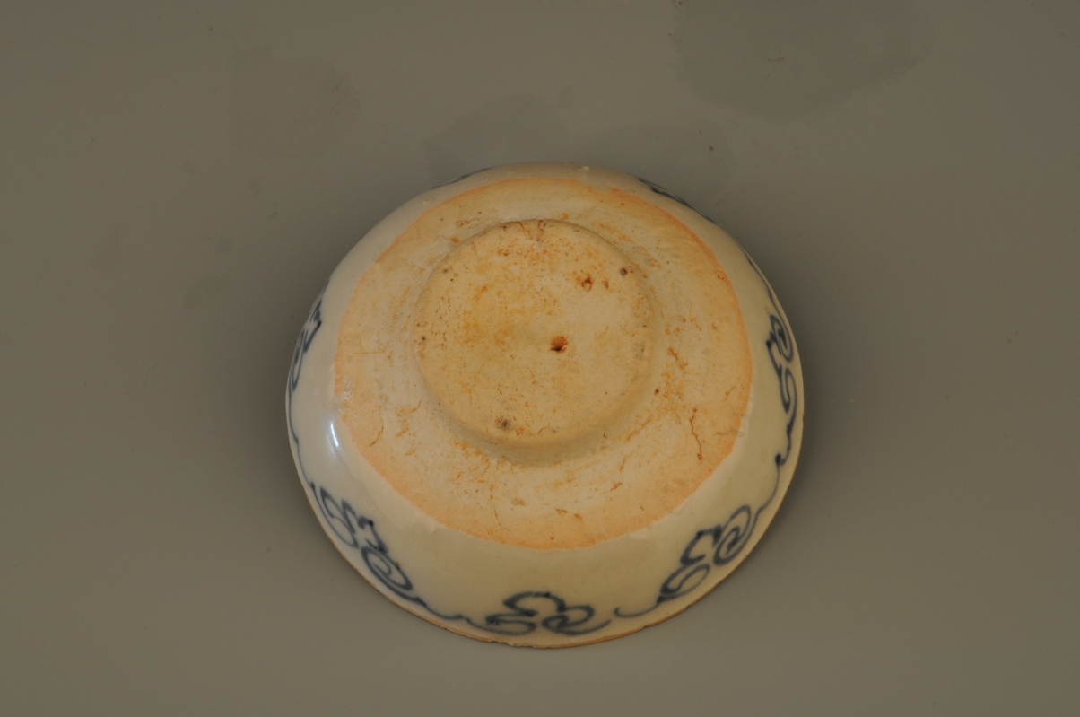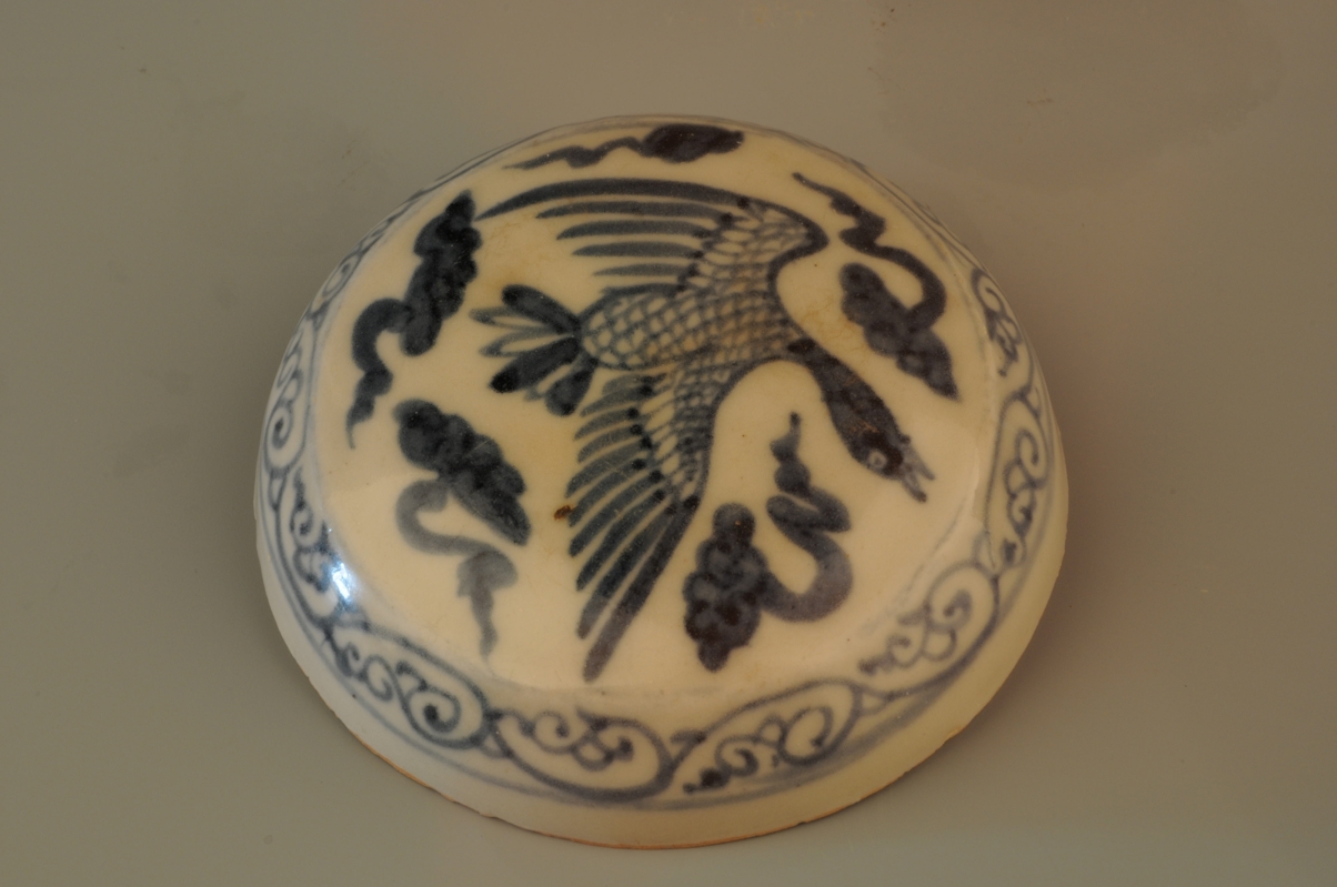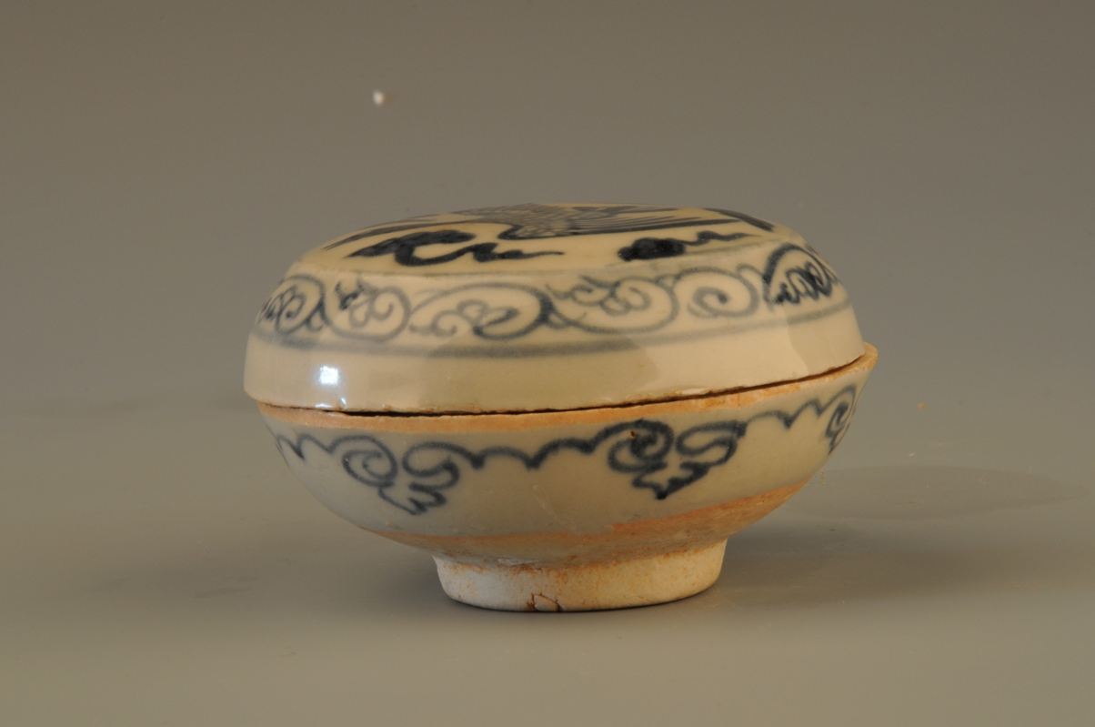 元代青花飞雁纹粉盒,盒分盒身与盒盖两部分,身盖相连接处设子母口, 盖面、 盖壁与器身外壁分别绘有线条粗细不等的卷草, 飞雁与灵芝纹饰。