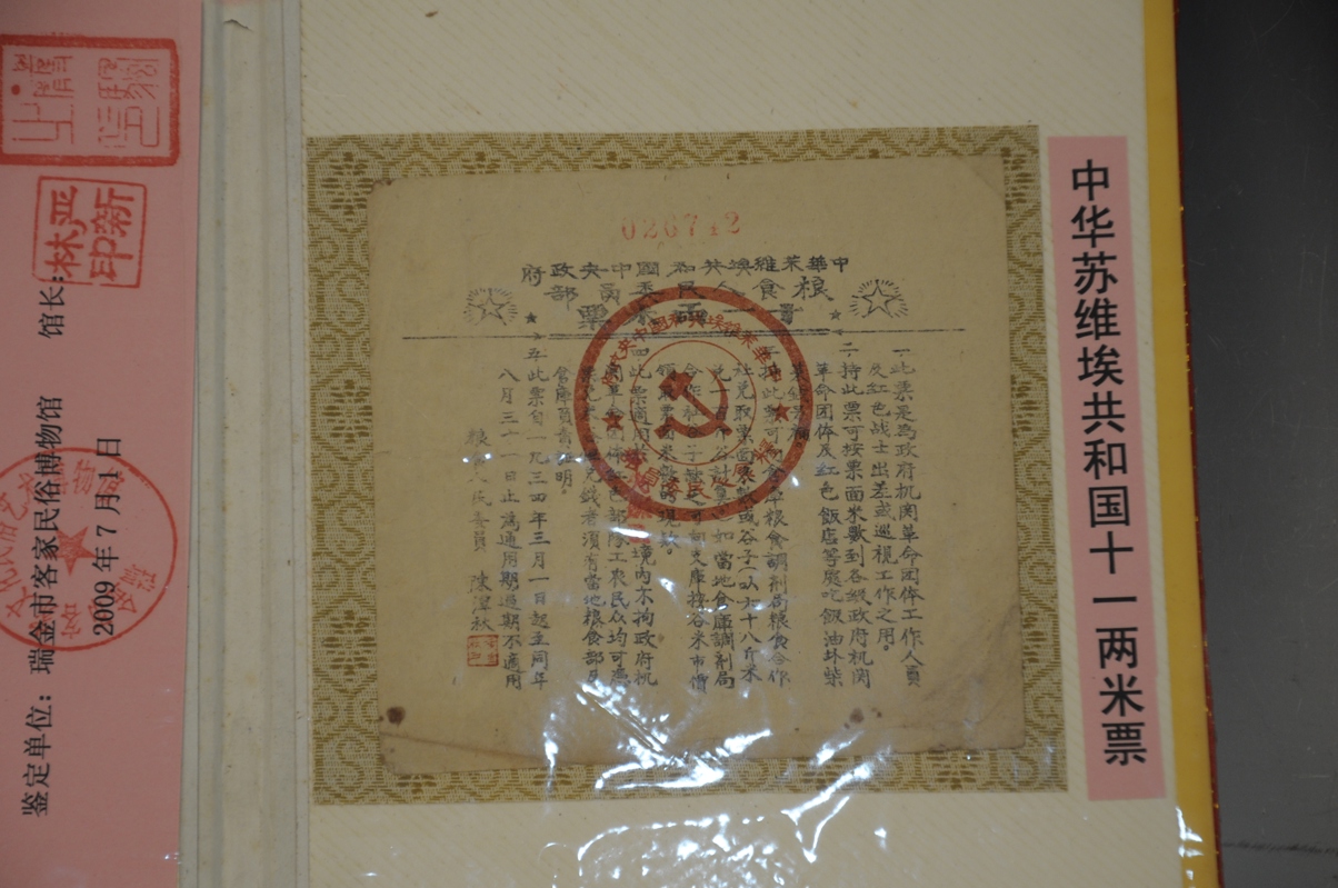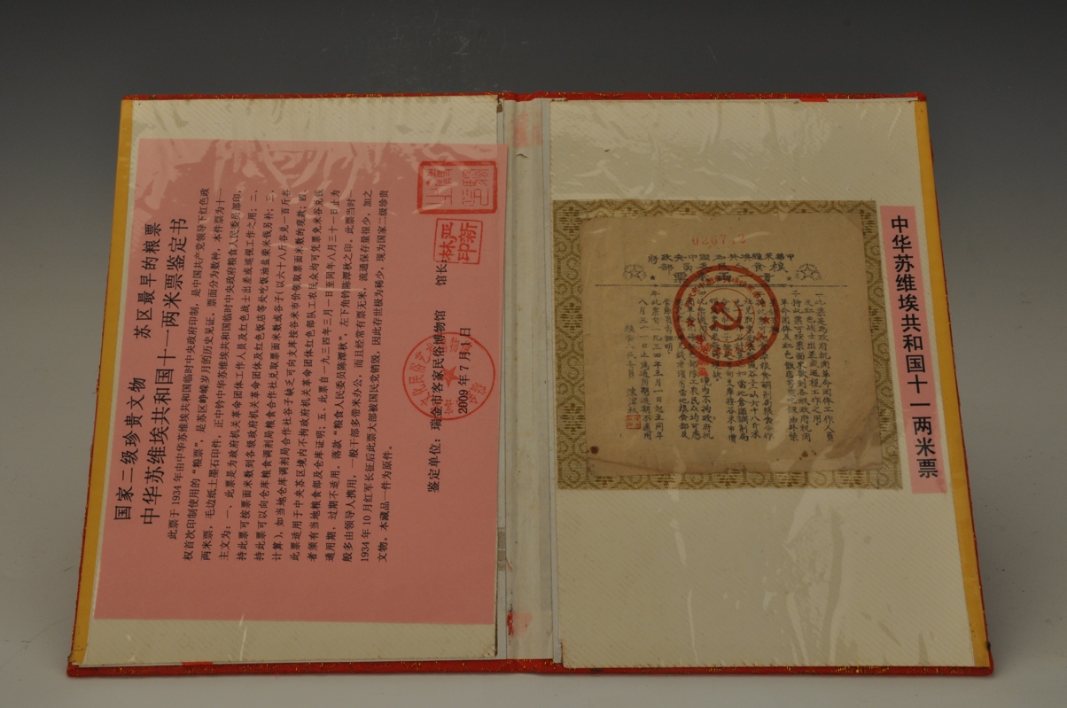 此票于1934年由中华苏维埃共和国临时中央政府印制,是中国共产党领导下红色政权首次印刷使用的“粮票”,是苏区峥嵘岁月的见证。票面分为数种,本件票为十一两米票,毛边纸土墨石印件,正中为中华苏维埃共和国临时中央政府粮食人民委员部印。此票当时一般多由领导人携用,一般干部多带米办公,而且经常有票无米,流通保存量很少,加之1934年10月红军长征后此票大部被国民党销毁,因此存世极为稀少。