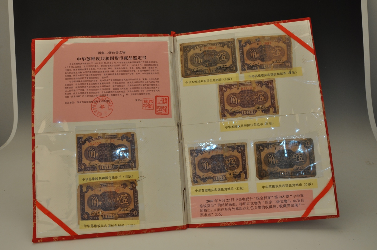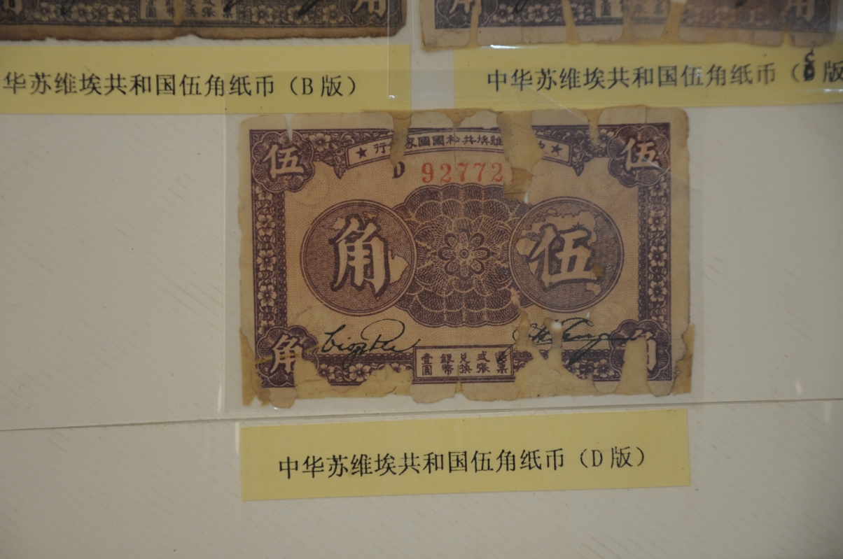 中华苏维埃共和国创立于1931年11月,次年2月,中华苏维埃共和国国家银行在瑞金叶坪成立,首任行长毛泽民。1932年7月,国家银行开始发行纸币,,面值分为壹分、伍角,贰角、壹角、壹圆5种。纸币的正面上端有“中华苏维埃共和国国家银行”字样,中间和四角印有币值,下端印有纸币与银行的兑换值。纸币的背面下端印有发行年份。壹元券和贰角券正面印有列宁像,另外,中华苏维埃共和国国家银行还铸造发行了紫铜质的伍分、壹分币。该纸币面值为伍角,是中国共产党领导苏区军民进行革命的政治、军事、经济斗争的历史见证。