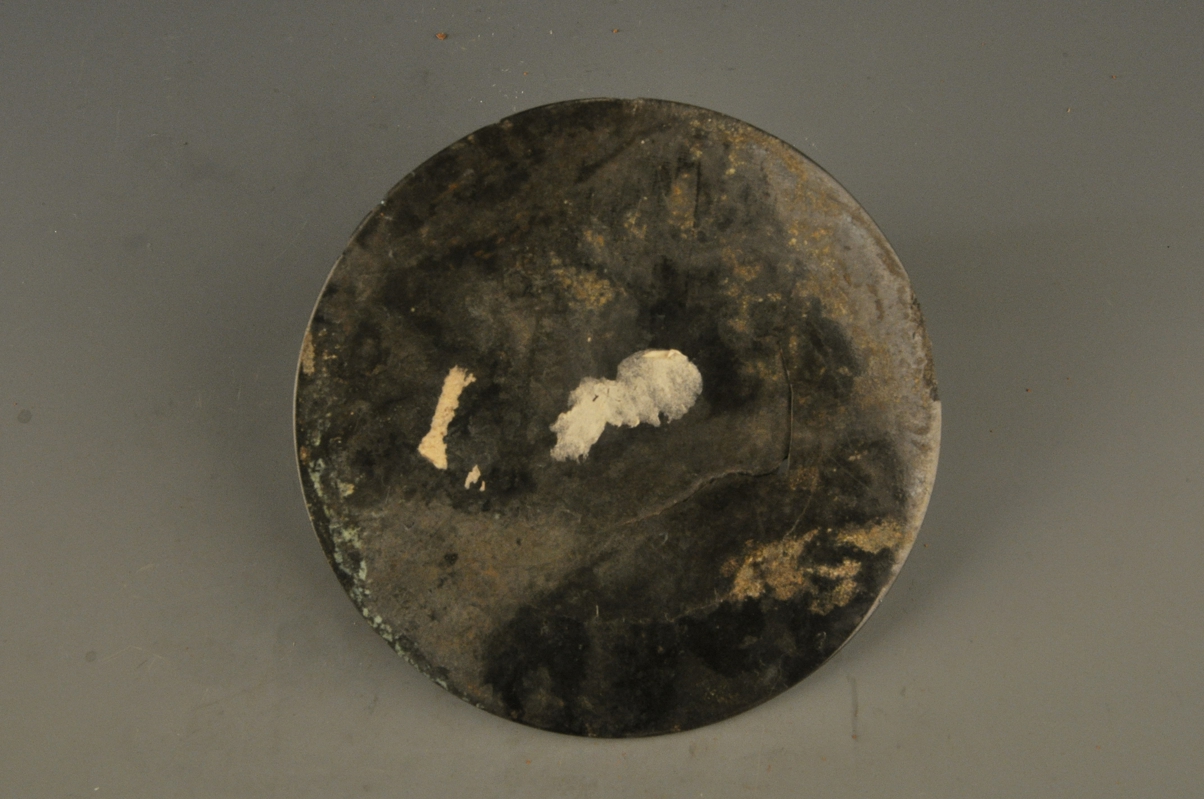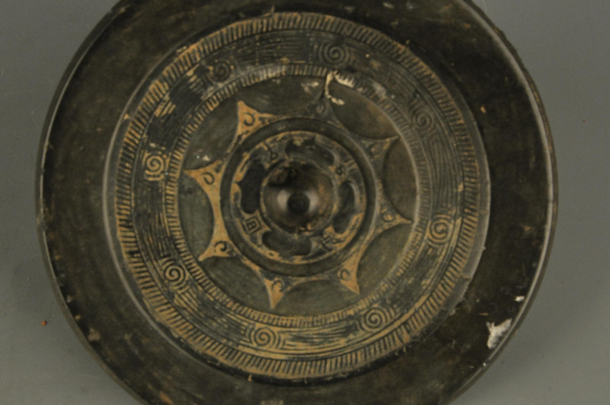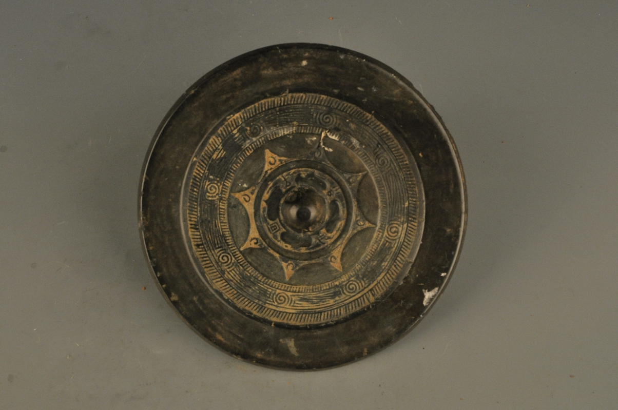 圆形,宽素缘,圆钮,无钮座。纹饰分内中外三区,内区为如意云纹,中区为连弧纹,以一圈弦纹为间隔,外区为一圈凸起的短斜线栉齿纹和一圈螺纹