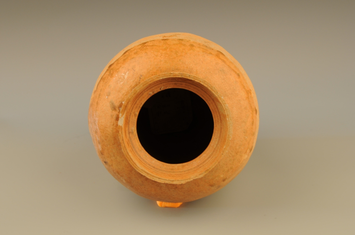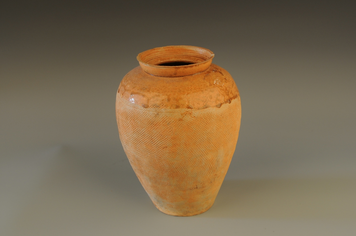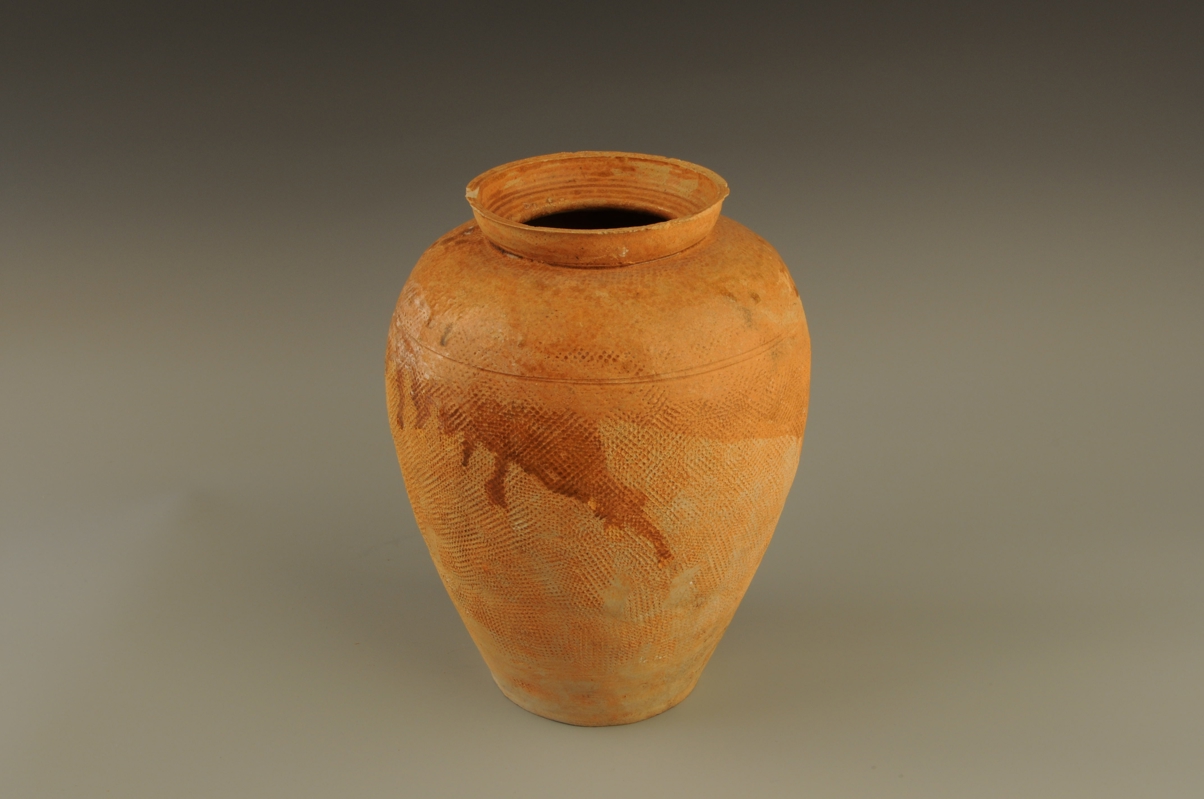 侈口,束颈,溜肩,斜腹,平底,器口沿内壁饰多重弦纹,通体饰网格纹,口沿及肩部施青釉,釉不及底。