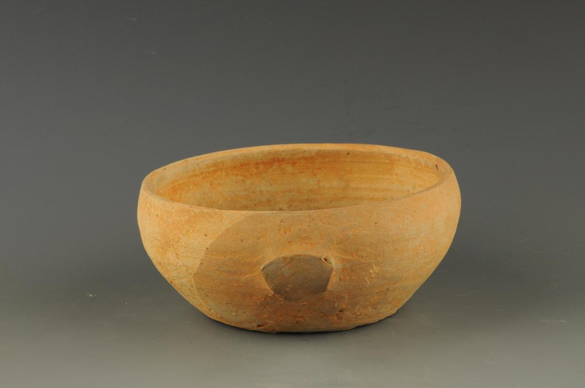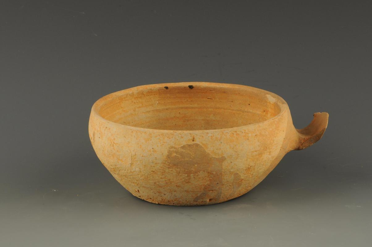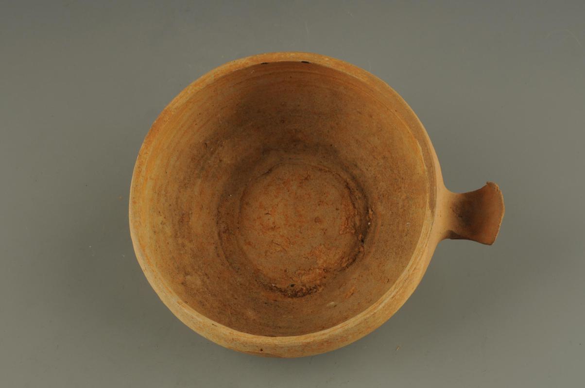 口微敛,弧壁,圆腹,平底。腹部一侧置一弧形鋬耳,素胎。1987年抚北镇东汉墓出土。