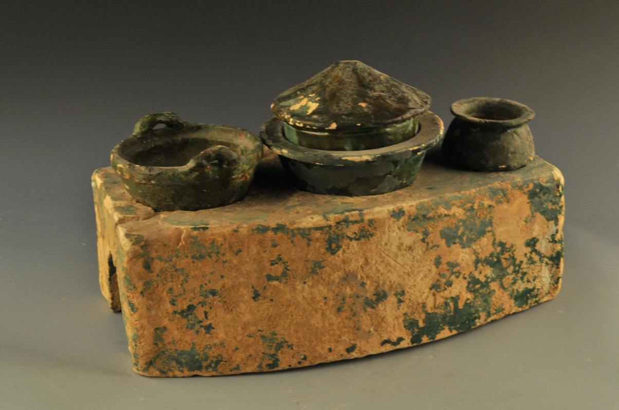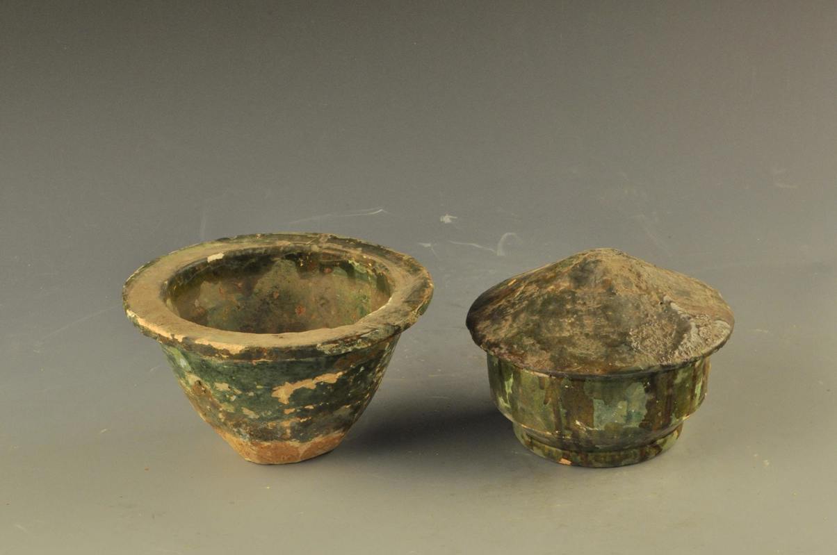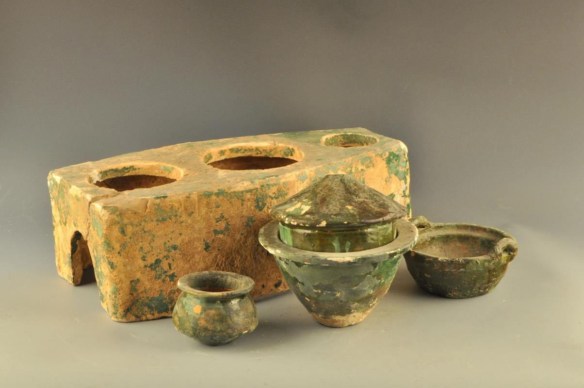 泥质灰陶,平面形状近梯形,两侧外弧,上端有三个灶眼,并放置甑、锅等炊具,灶门呈弧状。87年抚北镇东汉墓出土,通体施绿釉,部分脱落。1987年抚北镇东汉墓出土