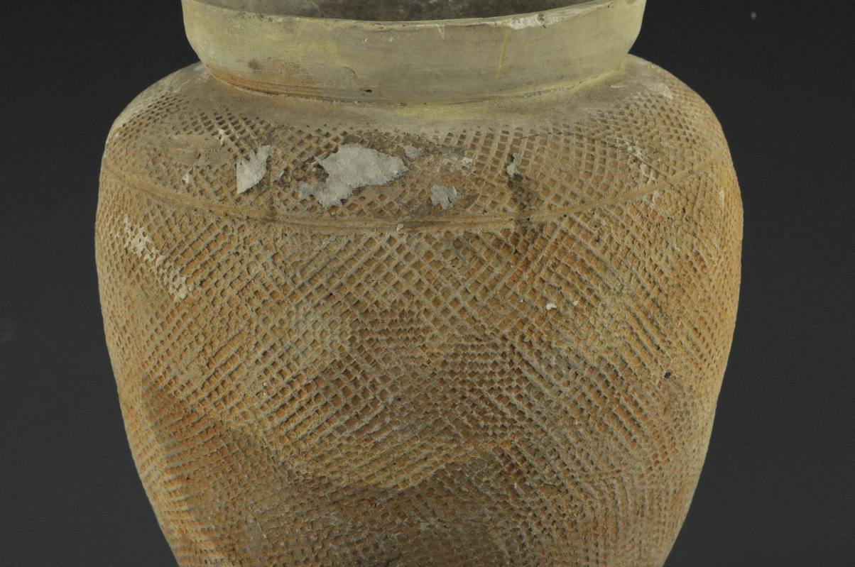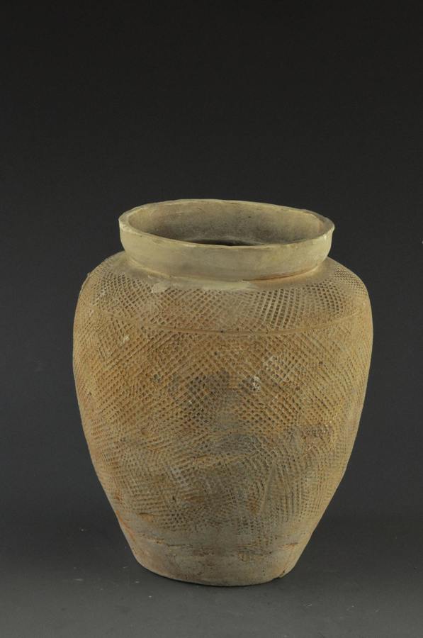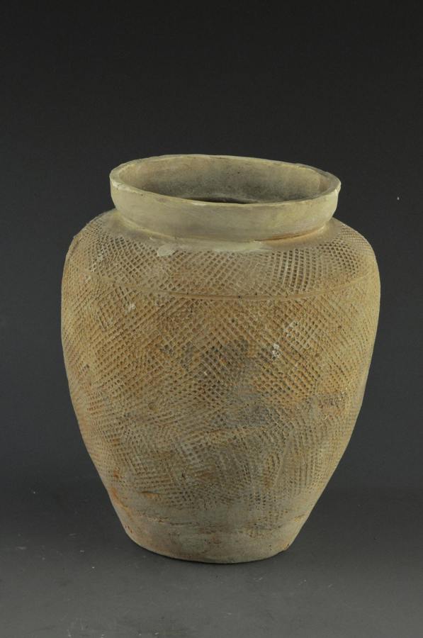侈口,丰肩,深弧壁,平底。长圆腹至下渐收,器身满饰拍印的网格纹,灰陶质。1987年抚北镇东汉墓出土。