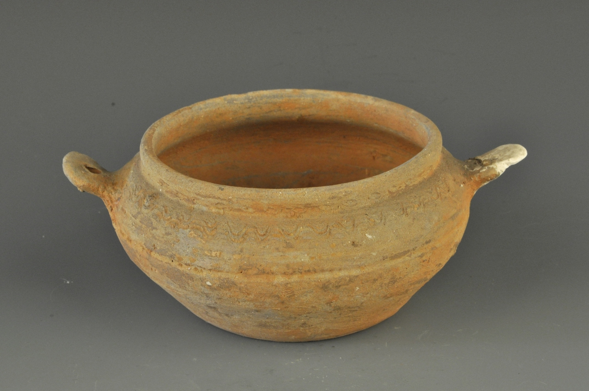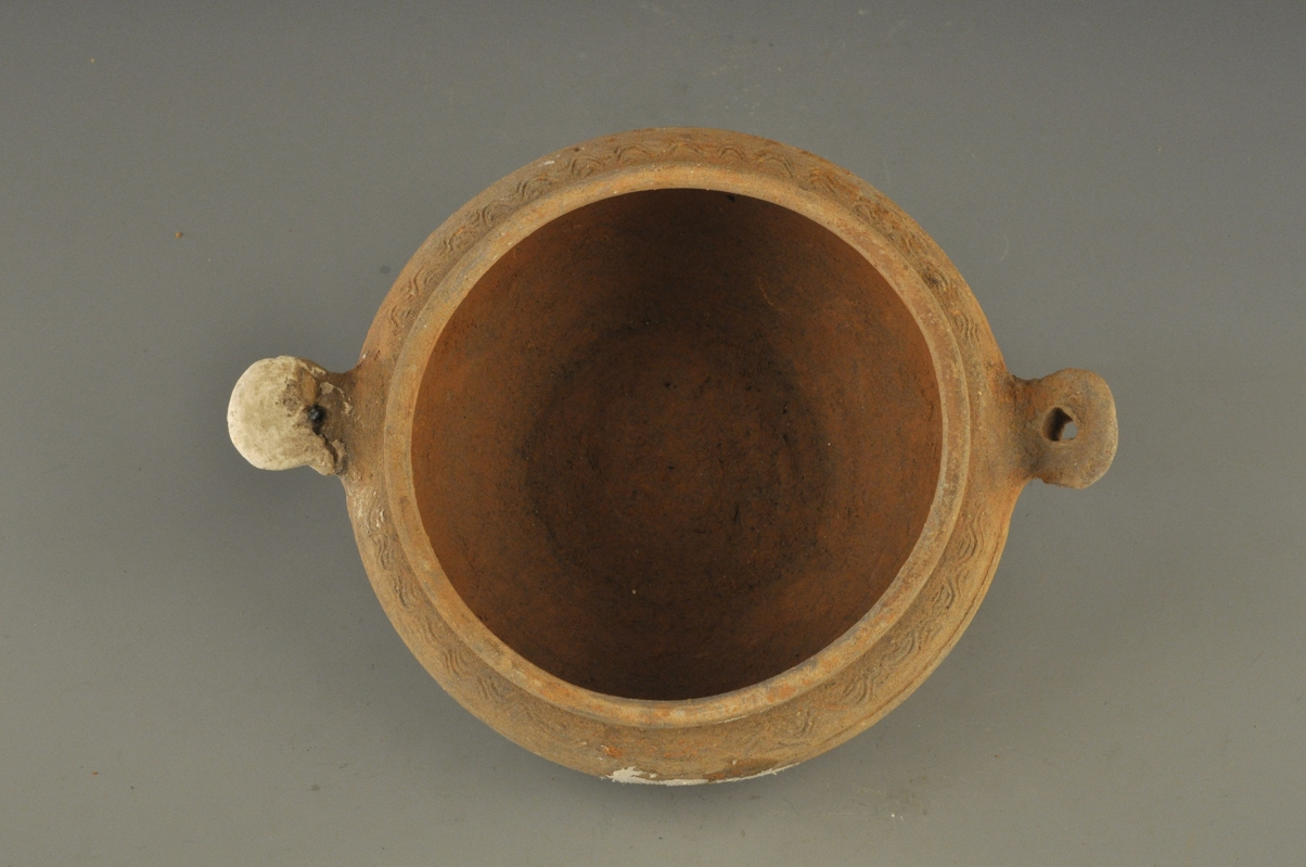 直口,扁圆腹,平底。肩部对应各安有一耳,并依稀可辨~纹,腹部饰一圈弦纹,素胎,胎质坚硬。