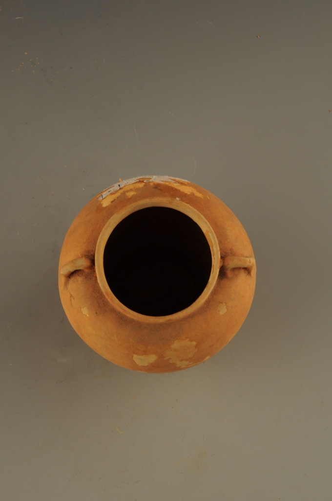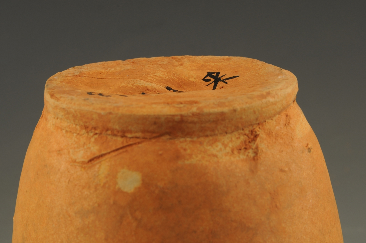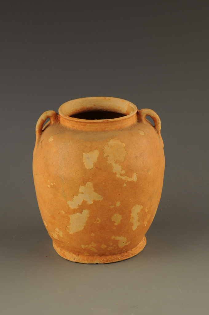 直口,丰肩,长圆腹,圈足。肩部对应各堆塑一条形系。通体施青釉,开冰裂细片。1987年抚北镇工地出土。