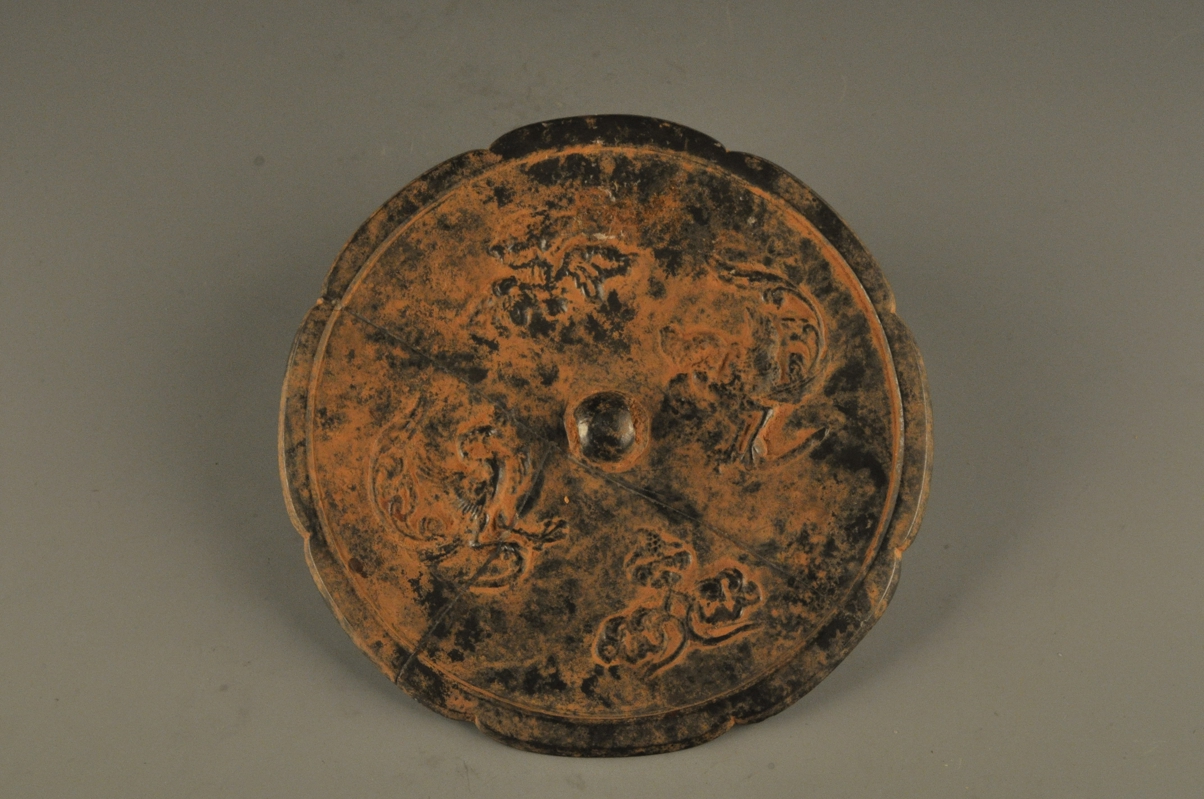 八瓣葵形,窄素缘,圆钮,无钮座,区内饰双凤朝阳纹饰,镜面光洁。