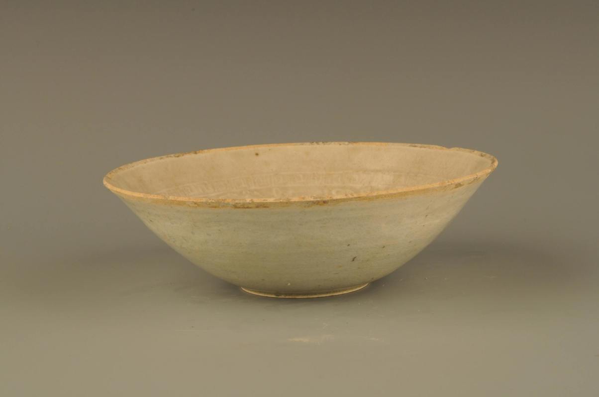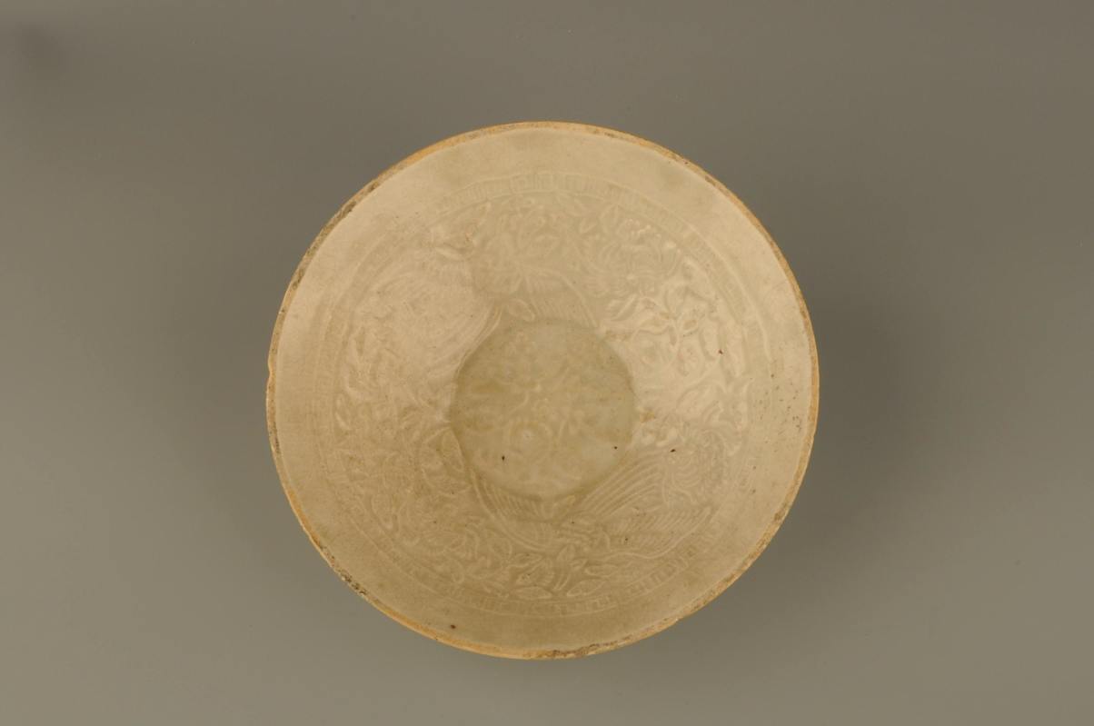 高6cm口径18 7cm足径6 3cm·重0 21kg。敞口,斜壁,矮圈足,碗内壁模印一圈回纹和双凤纹,碗心模印莲瓣纹,口沿无釉,通体施青白釉。