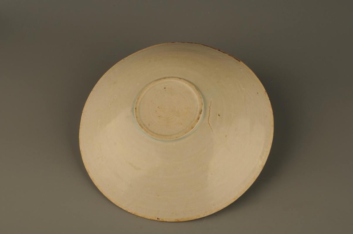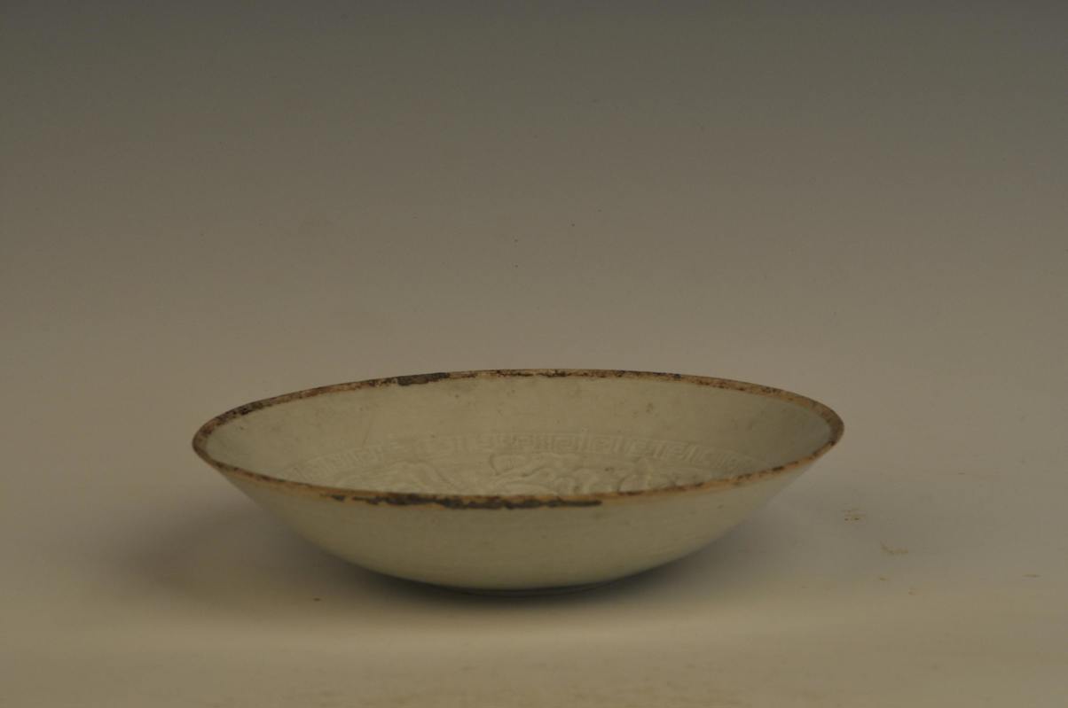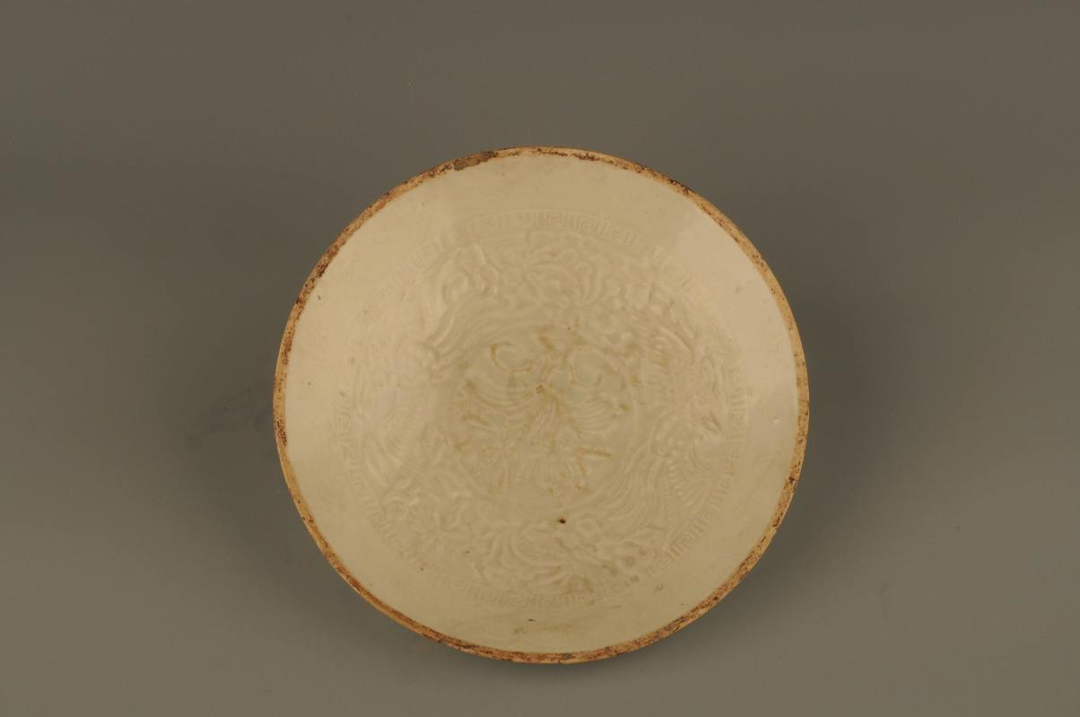 敞口、斜壁、矮圈足,碗内壁模印一圈回纹,碗心模印莲瓣纹,口沿无釉。