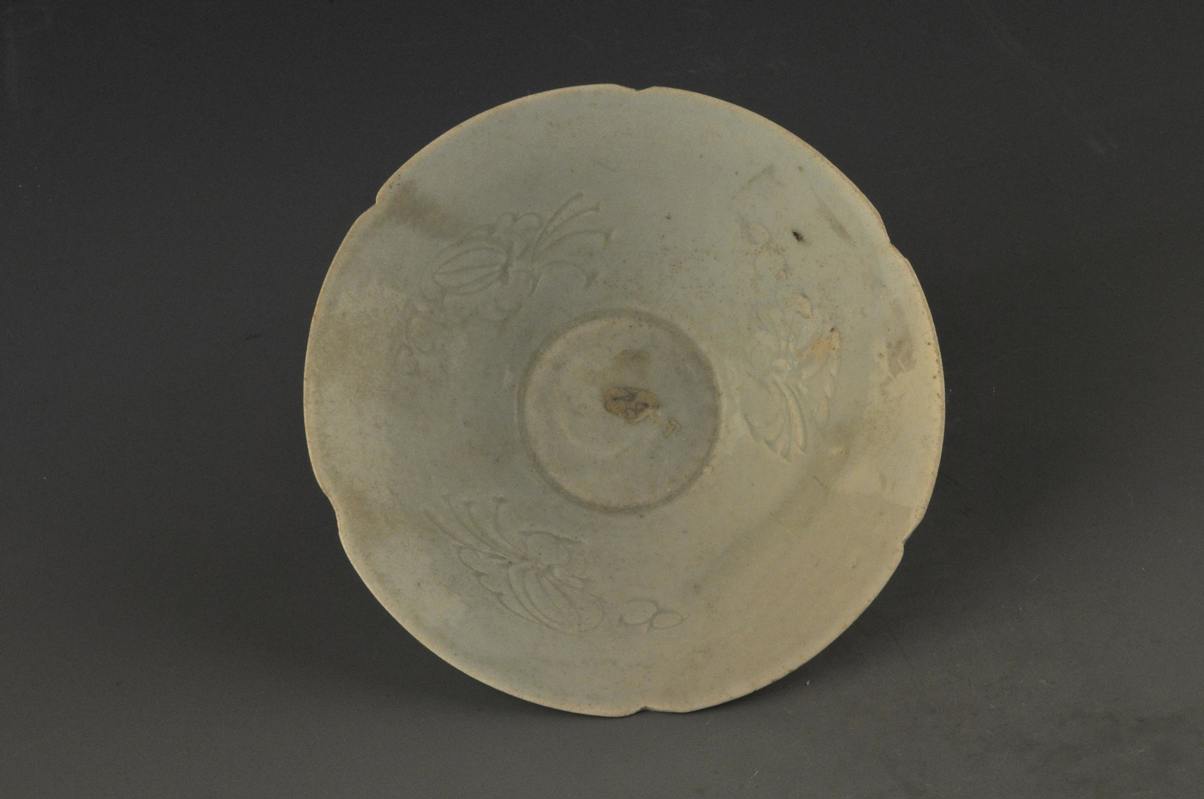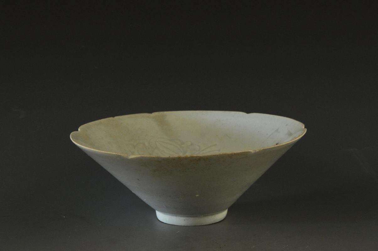葵口,腹壁向内斜收,圈足,由于造型似斗笠,故又称斗笠碗,碗内壁满划春草花卉纹饰,通体施青白釉。