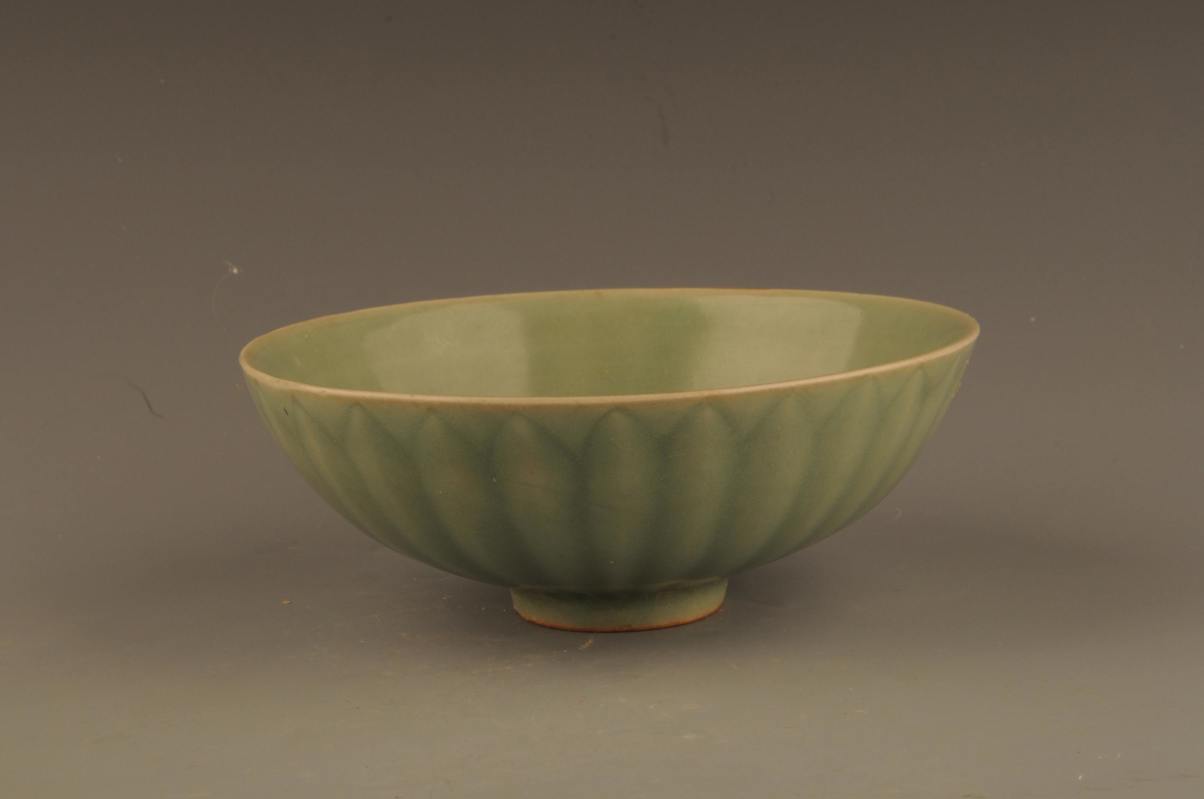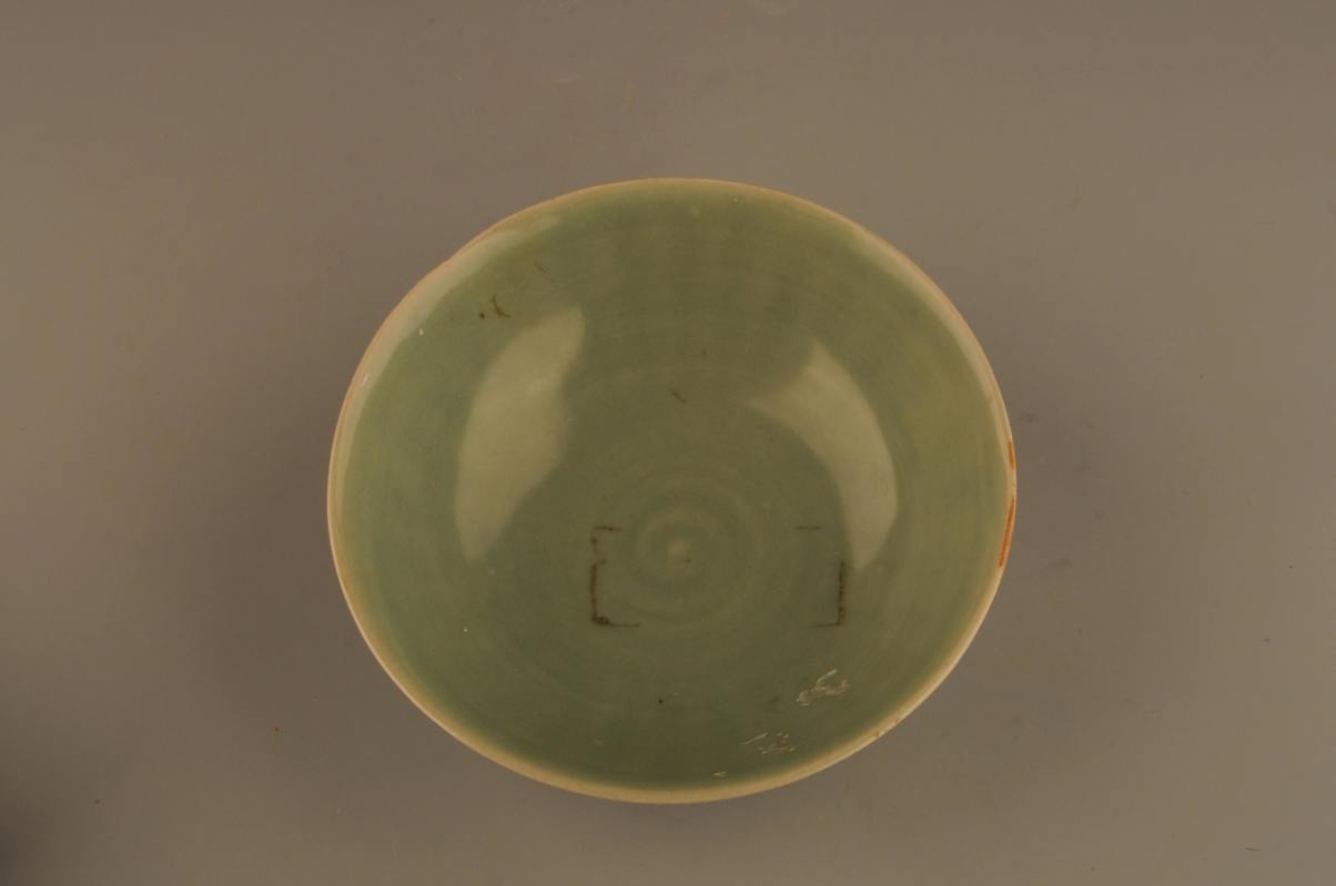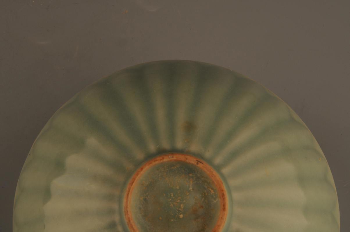 尺寸:高5 9cm,口径15 4cm,底径4 4cm规格:敞口,浅弧壁,矮圈足,器外壁饰莲瓣纹,胎厚,通体施青釉。