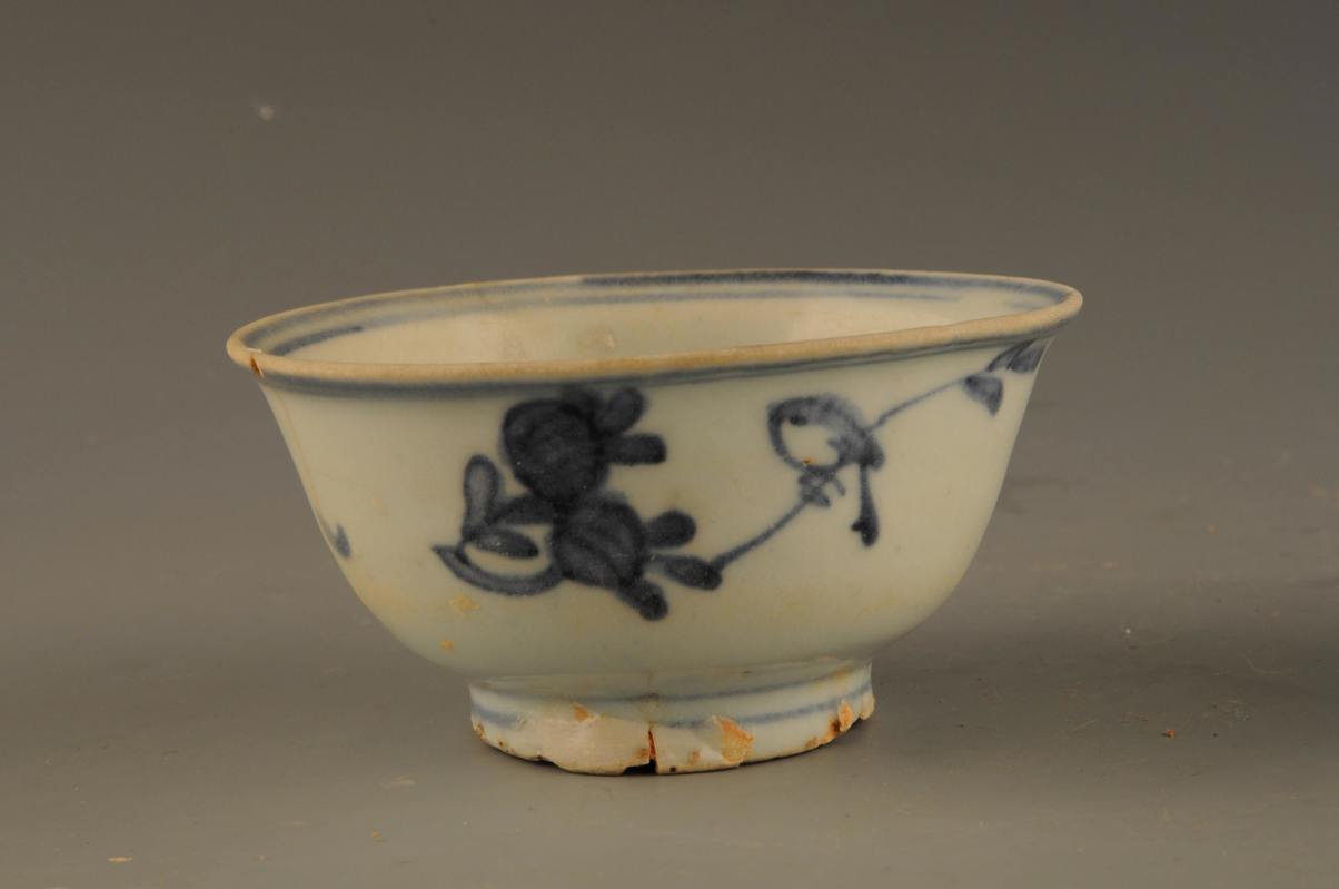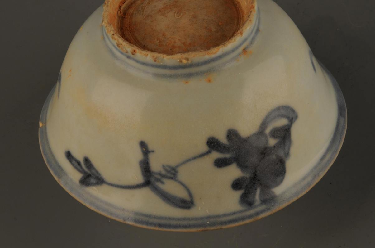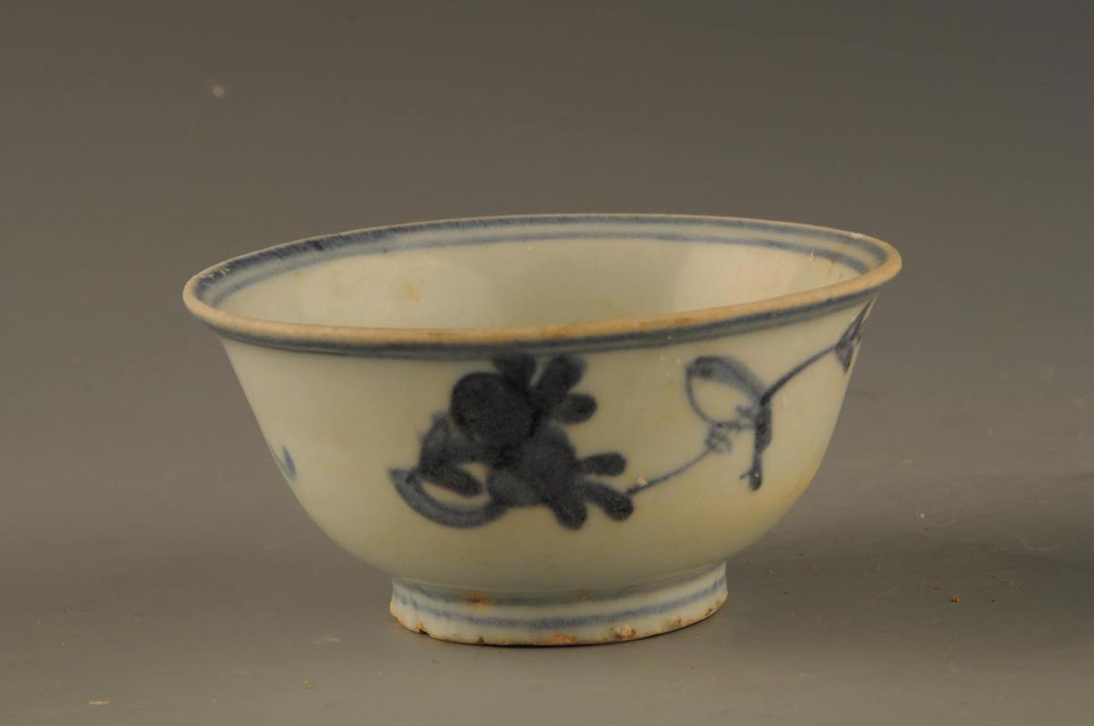 形态特征:口微撇,深孤壁,圈足。碗内壁近口沿处及内底以青料各绘二圈弦纹,碗外壁以青花花卉图案为饰。尺寸:高5 1cm,口径10 1cm,底径4 7cm