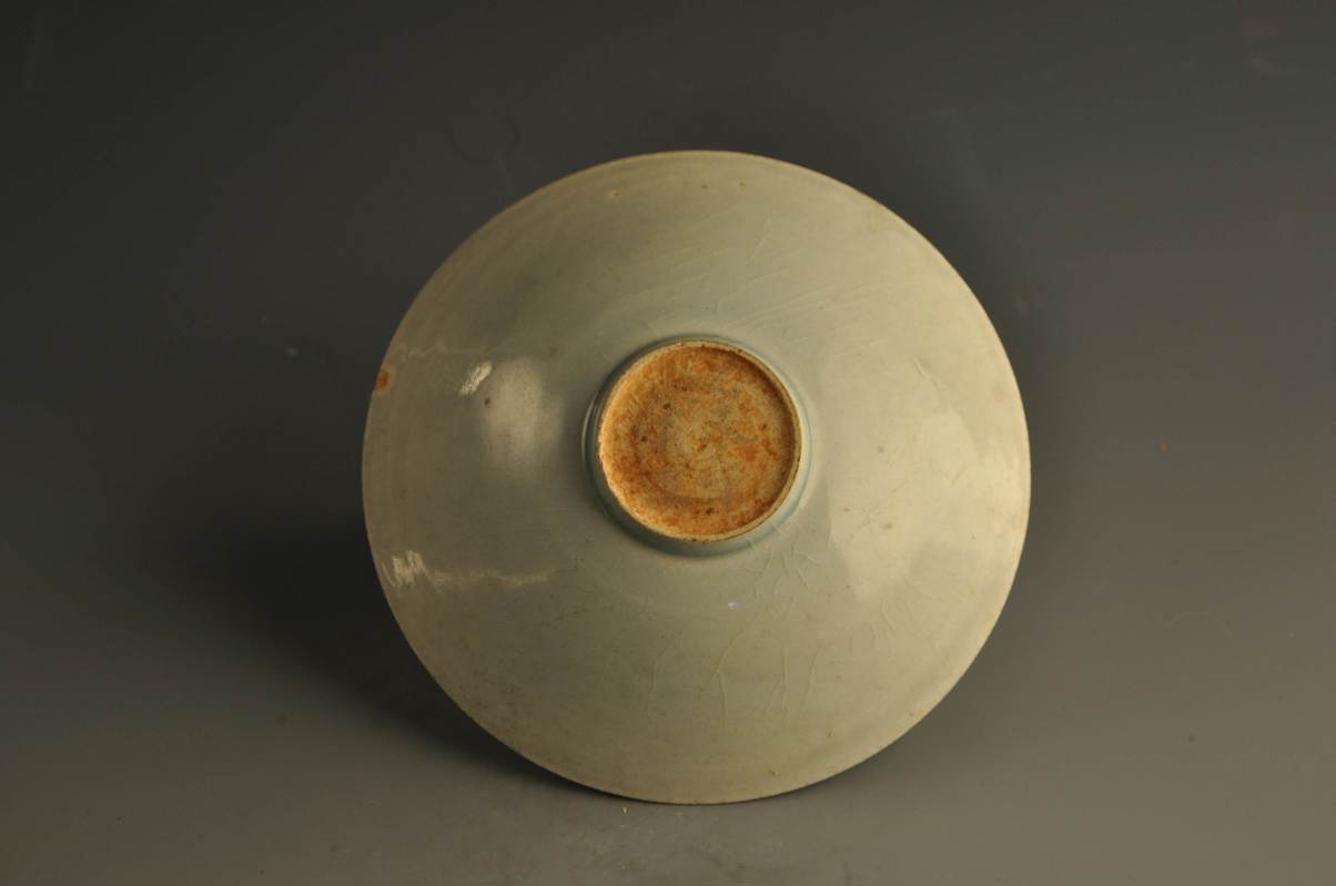 形态特征:敞口,深弧壁,矮圈足,碗内壁满划云龙纹饰,通体施青白釉。尺寸:高6 4cm,口径16 9cm,底径5 2cm