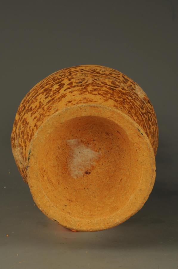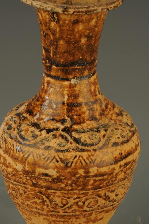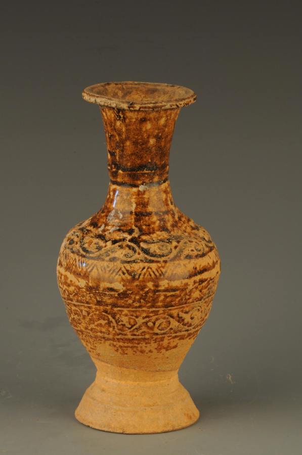 形态特征:撇口,方唇,长颈,斜溜肩,鼓腹,外撇高圈足。肩部饰两道弦纹,弦纹之间饰一圈叶脉纹,通体施酱釉,釉不及底;尺寸:高16 4cm,口径5.4cm,底径6.2cm