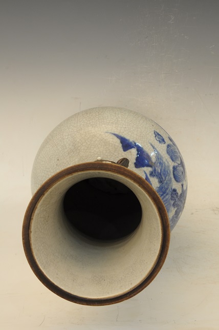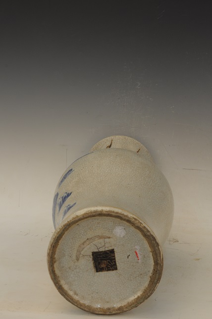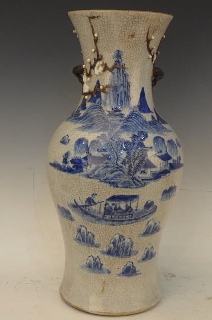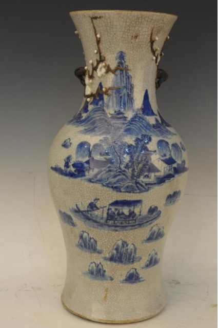 清哥釉青花山水行船堆梅纹双耳瓶