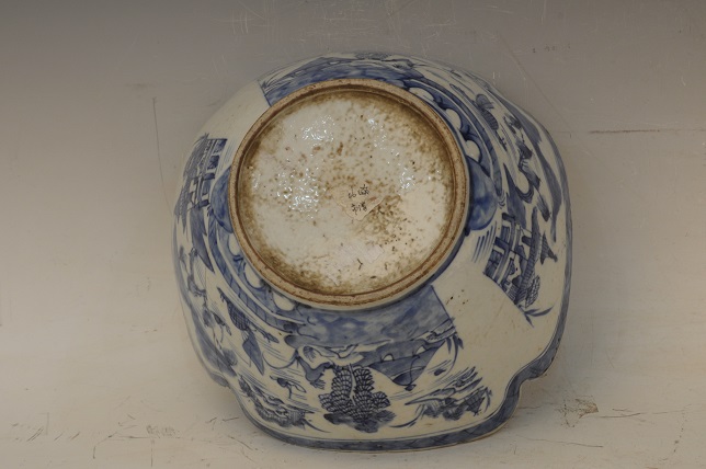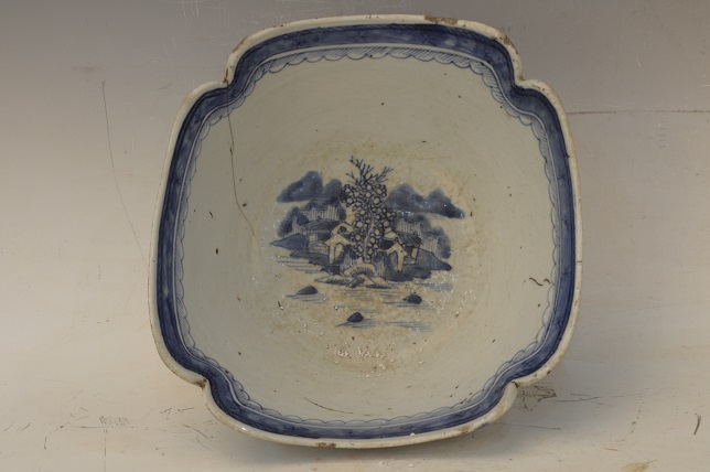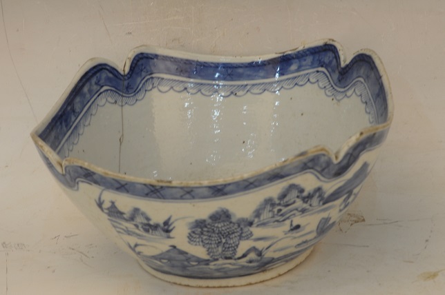 清青花山水楼阁纹方形花口盆