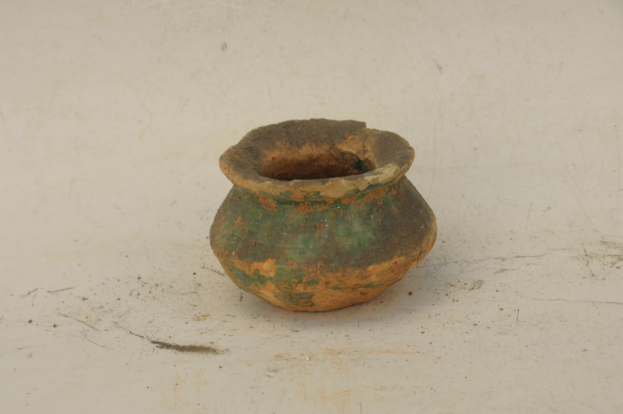 东汉绿釉束颈折腹圜底陶罐