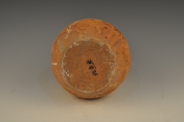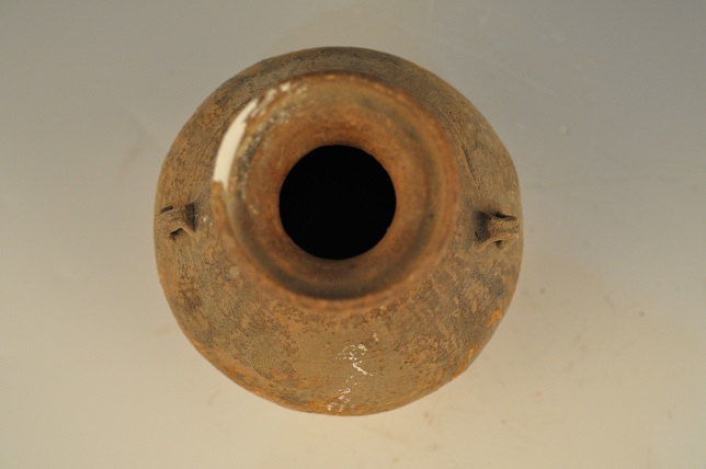 形态特征:洗口,圆唇,溜肩,平底,肩部对应各安置一系,腹部饰拍印的方网格,口沿有残缺,已修补。
