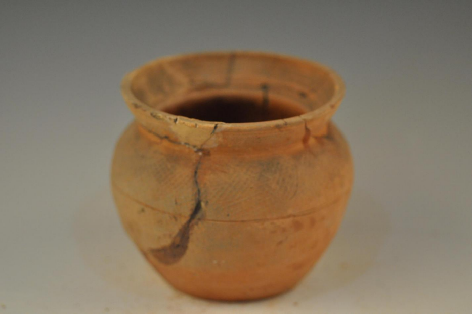 汉方格纹侈口束颈陶罐