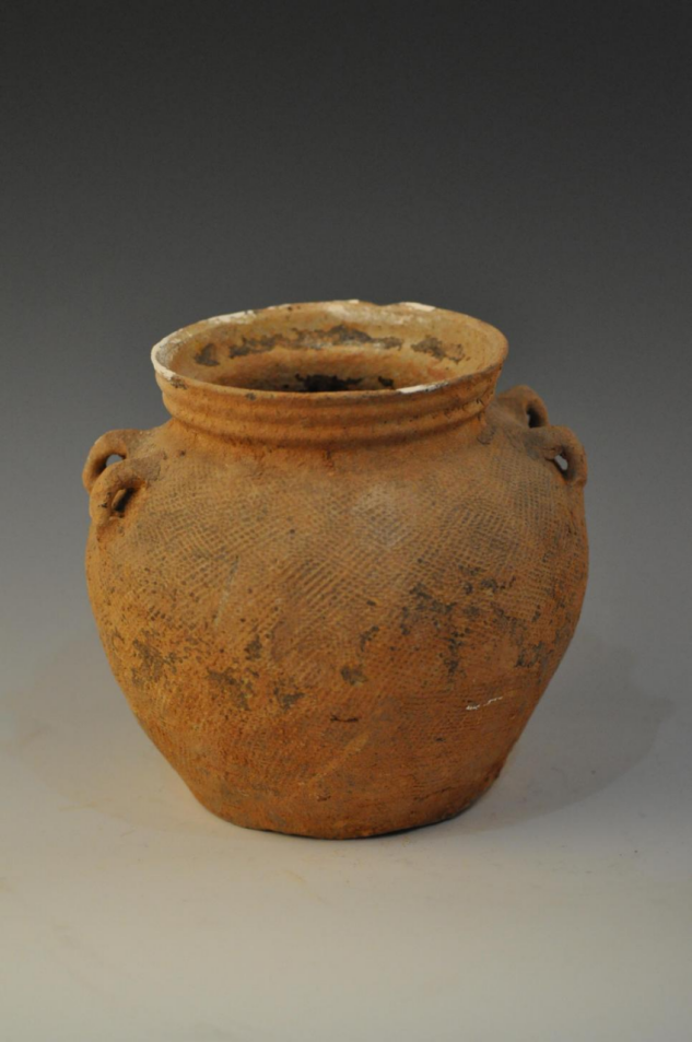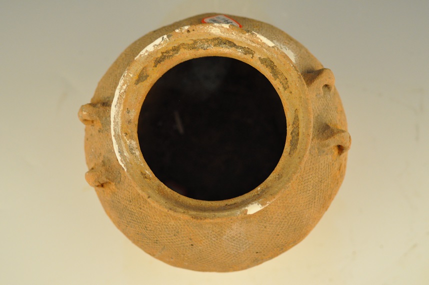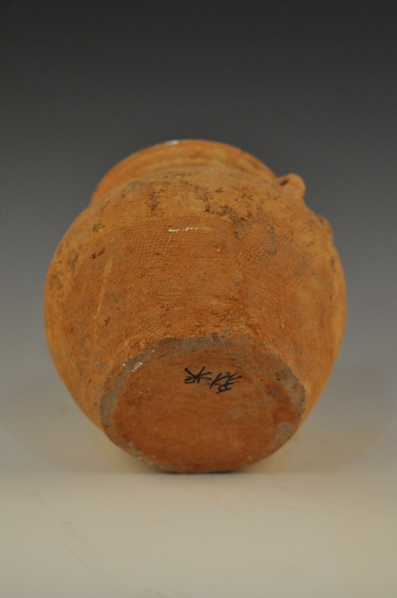 形态特征:侈口、束颈、丰肩、平底、颈部饰有凸起弦纹,肩部有四耳,器身以相印的方格纹为饰,釉面已剥落,器身残破,已修补。