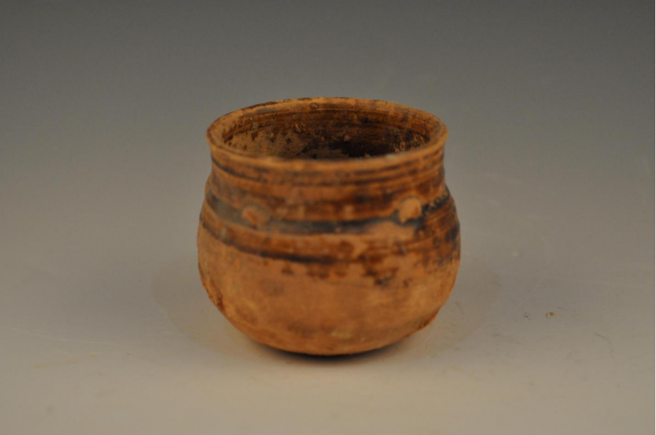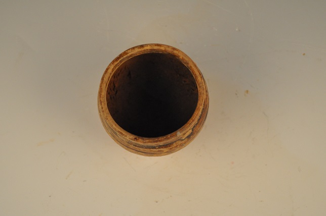 形态特征:口微外撇、束颈、圆腹、圈底微凹,内外施褐色釉,外壁釉不及底,釉面有剥落,颈部一圈饰乳丁纹,颈腹部均有弦纹。