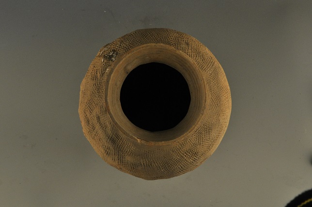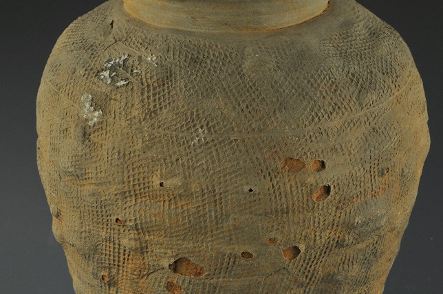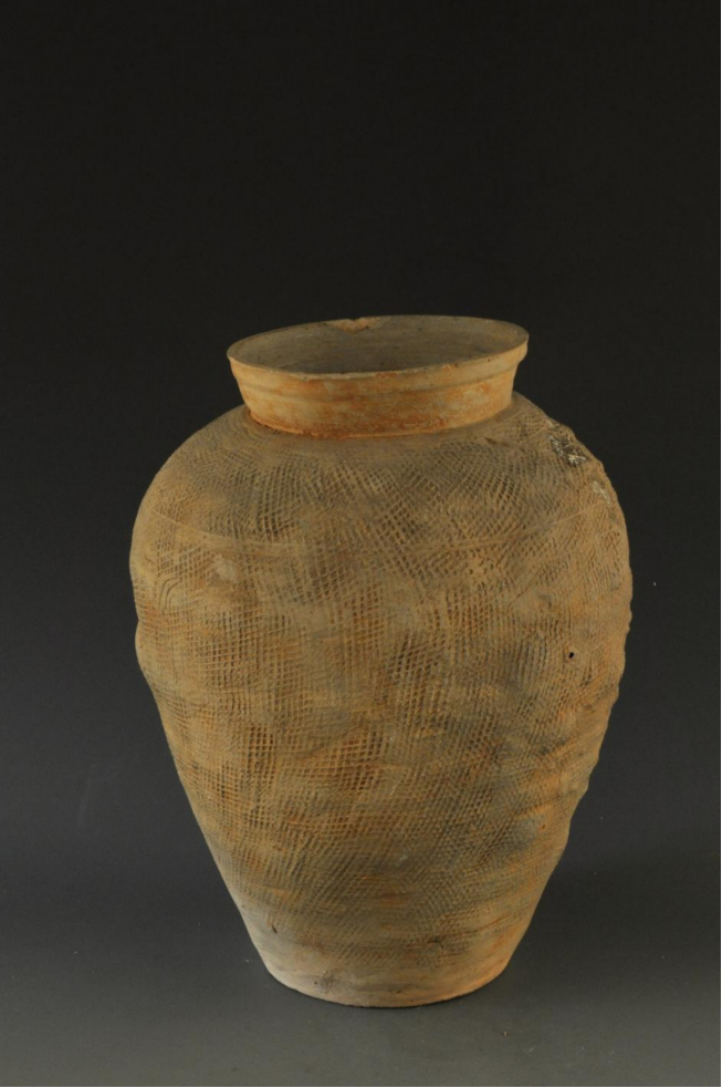 形态特征:侈口,丰肩,平底,长圆腹渐下收至底,通体饰网格纹。