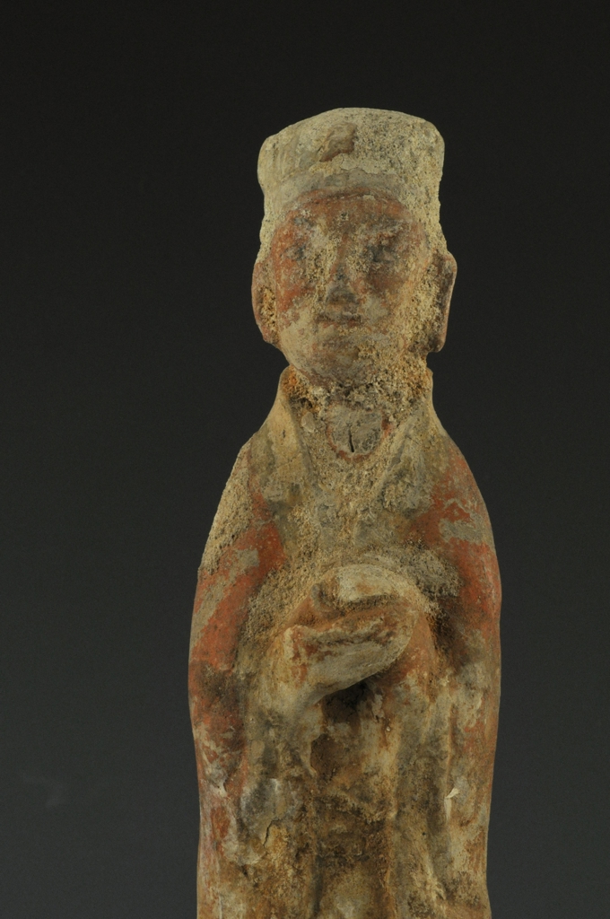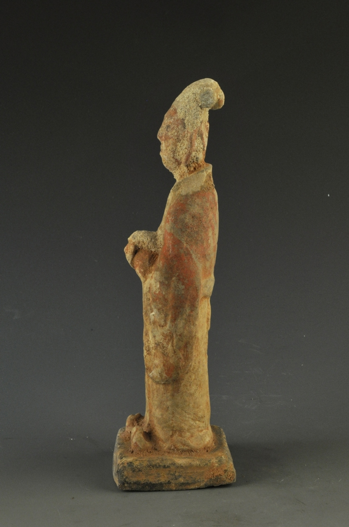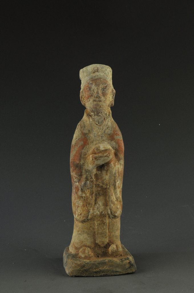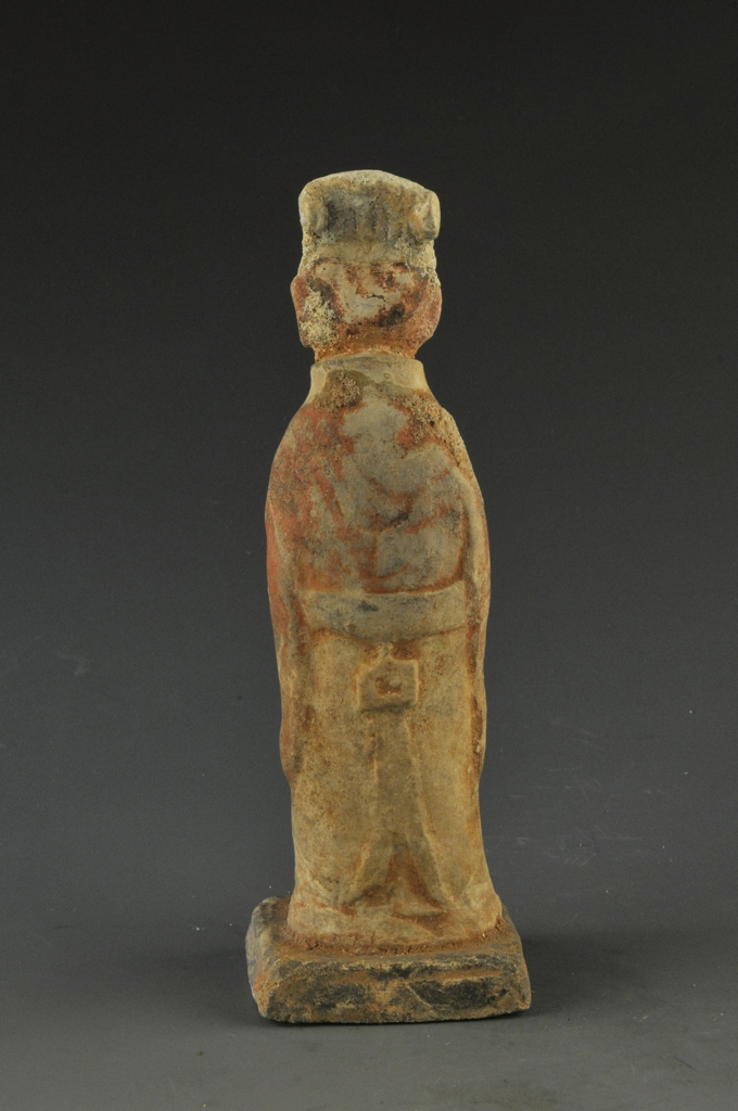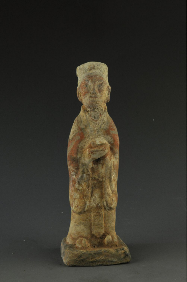 形态特征:陶质灰白,立人,宽袖长服冠帽,露靴,双手呈合抱状,面泛朱红色,底黄色,下有方形底座,釉色大部分脱落。