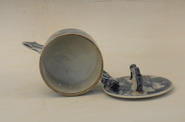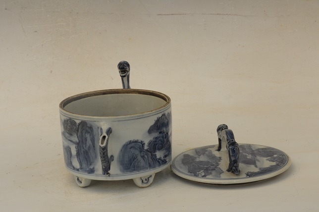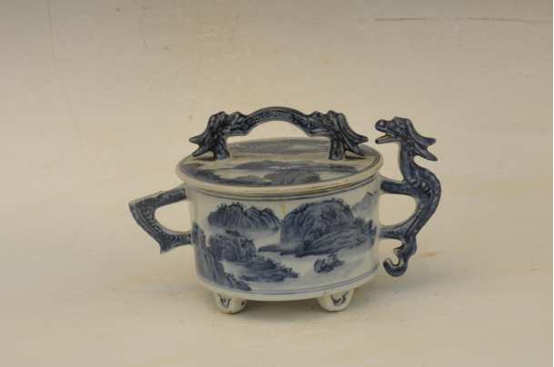 民国青花山水纹双龙耳四足带龙钮盖罐
