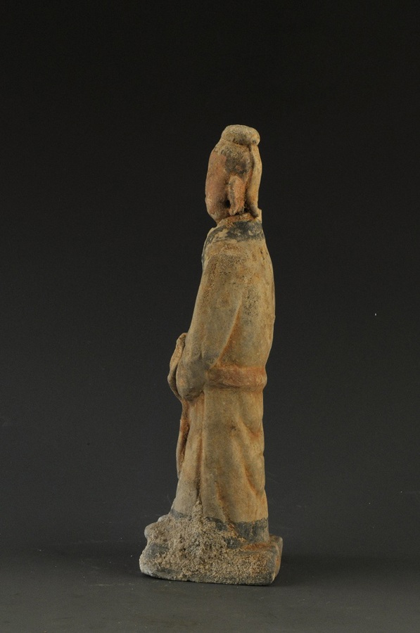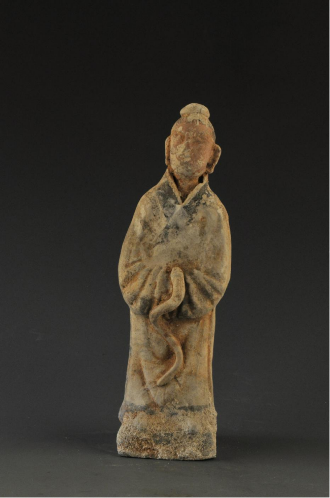 形态特征:陶质灰白,立人束发,面泛朱红色,底黄色,蛇缠于手,下有四方形底座,釉色大部分脱落。