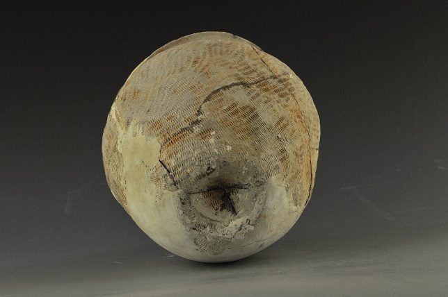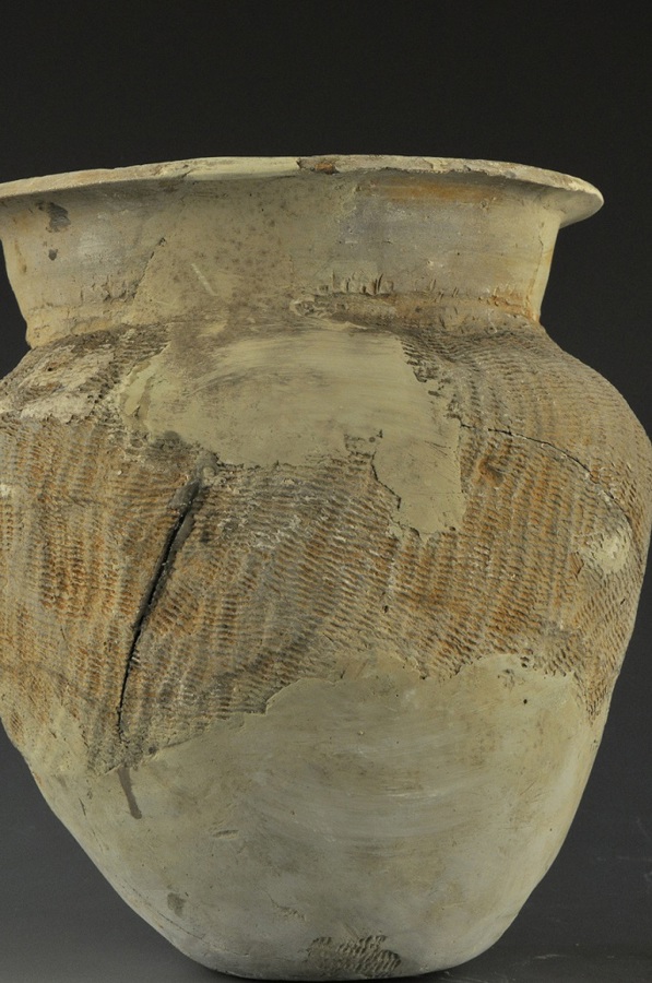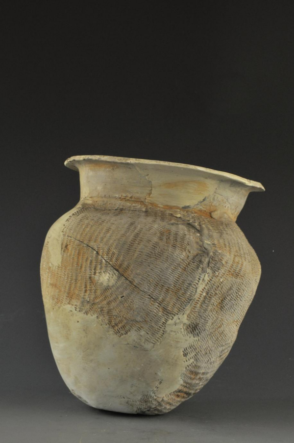 形态特征:宽板沿口,方唇,束颈,折肩,圆腹渐下收至底,平底微凹,器身以印纹为装饰,沿口至颈部有裂纹,1987年抚北镇商代遗址中出土。