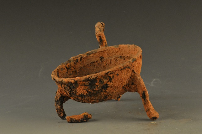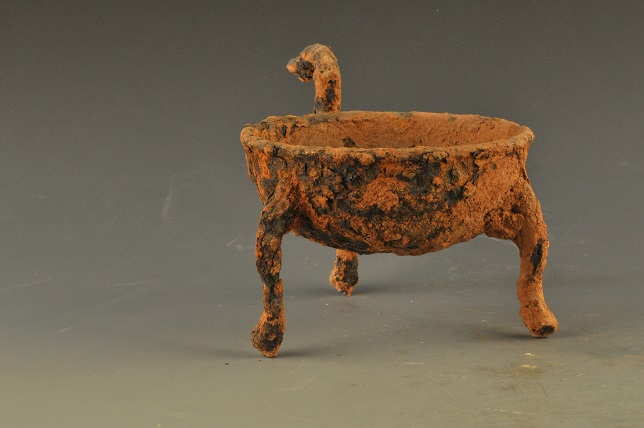 形态特征:铁质,器身作盆状,附Z形柄,柄端作鸟状,通体锈掩,三足已断一足,1987年抚北镇东汉墓出土。