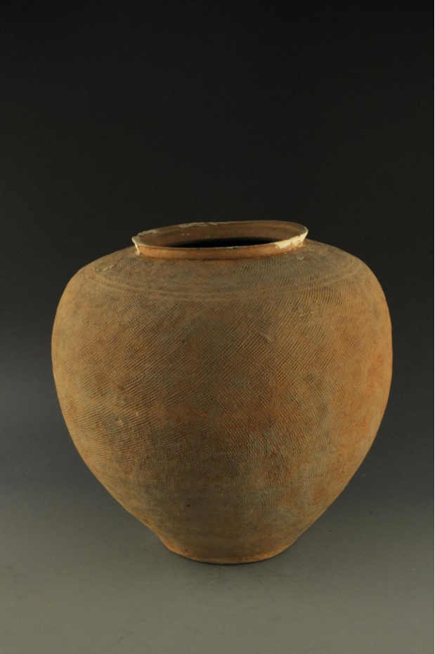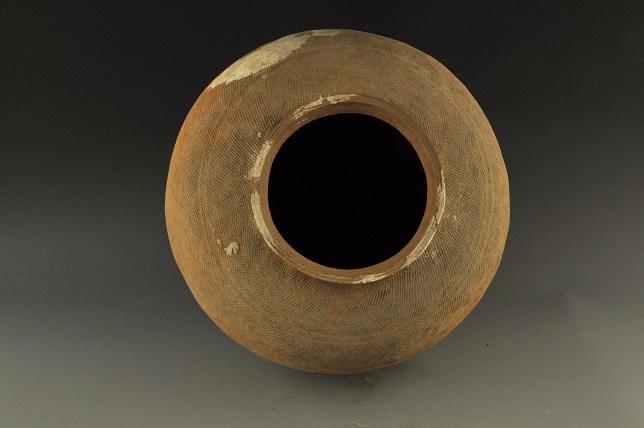 形态特征:灰陶质,侈口,丰肩,浑圆,腹至下渐收,平底。胎体厚重坚硬,造型雄浑饱满,器身以网格纹为饰,具有浓郁的乡土气息。1987年抚北