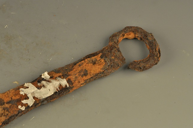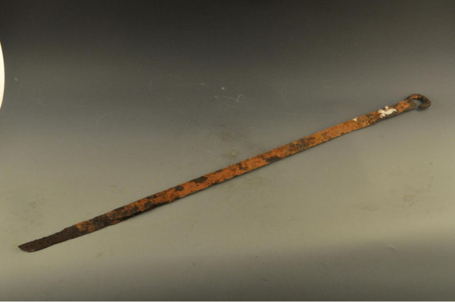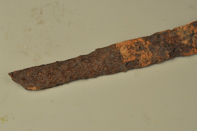 形态特征:扁长,单面刃,断面呈三角形,环首。通体锈掩。1987年抚北镇东汉墓出土。