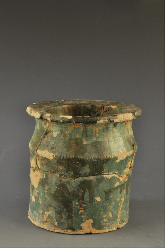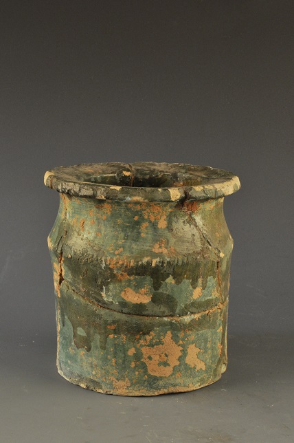 形态特征:井身作桶状,平底,通体施绿釉,部分脱落。87年出土抚北镇东汉墓出土。