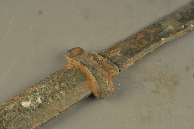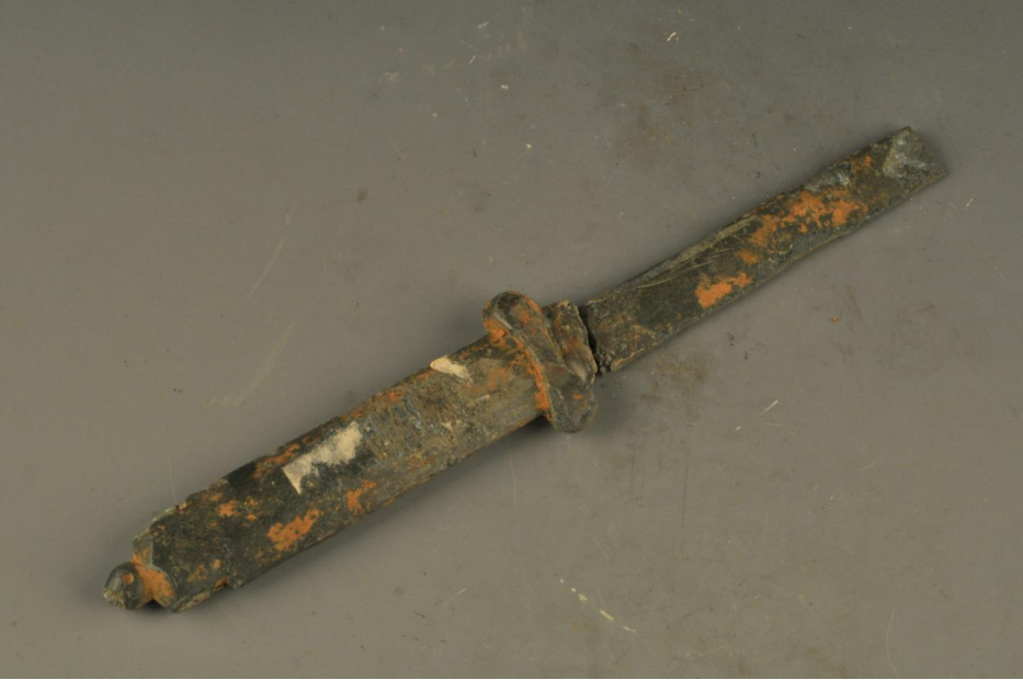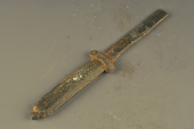 形态特征:铜质短刀,直背,断面呈三角形,单刃,茎首置一穿孔耳。便于配带,属古代兵器。发掘出土时断成二截。