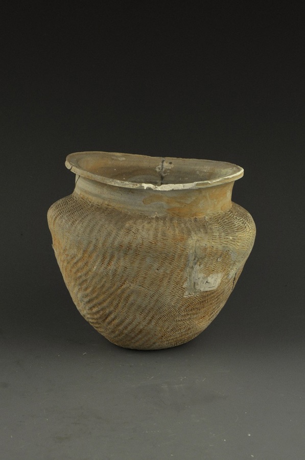 商平肩绳纹侈口灰陶罐
