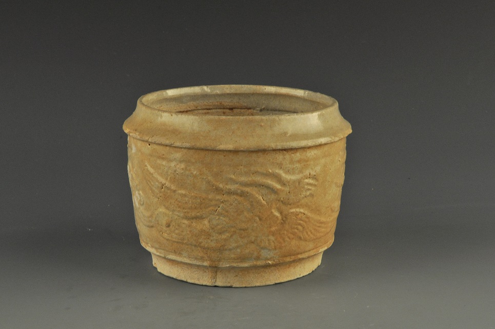 形态特征:罐口折沿,圈足,器身作桶状,深腹,腹部剔饰双凤纹饰,通体施青白釉,口沿无釉。