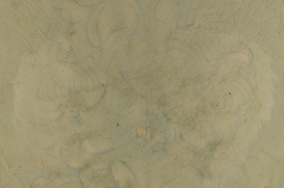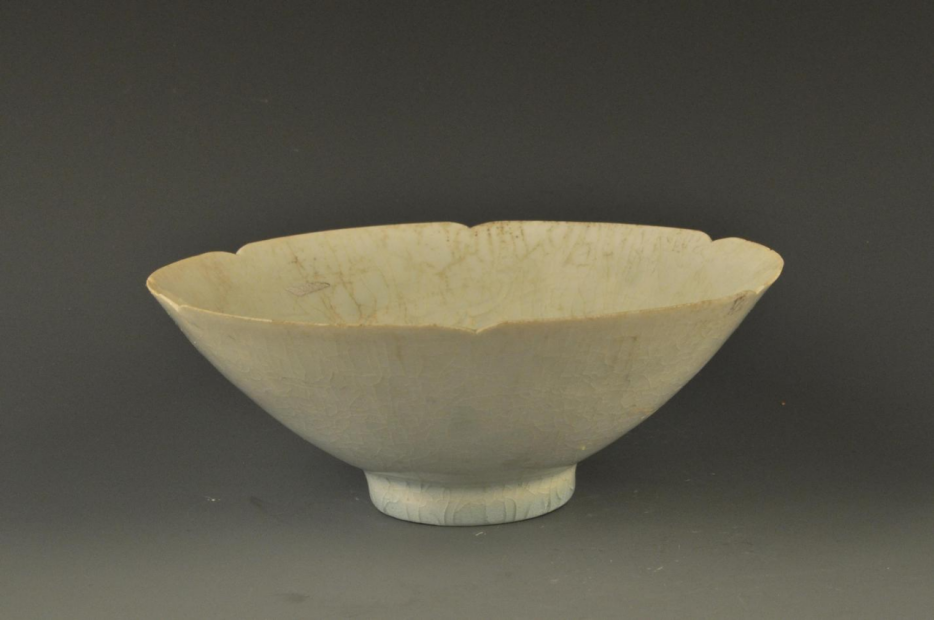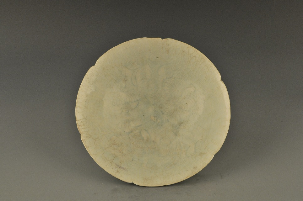 形态特征:葵口,深弧壁,矮圈足。碗内壁满划卷草纹饰,开冰裂纹,通体施青白釉。沿口稍缺。