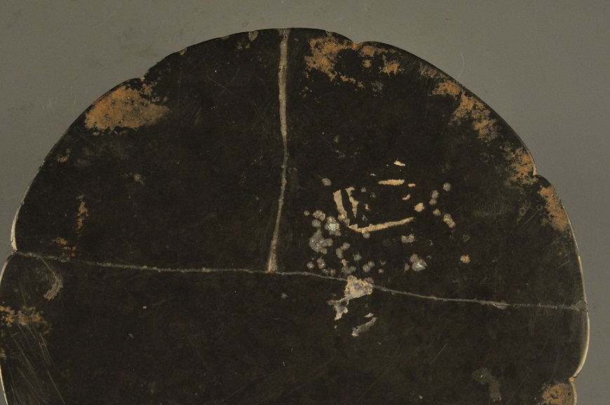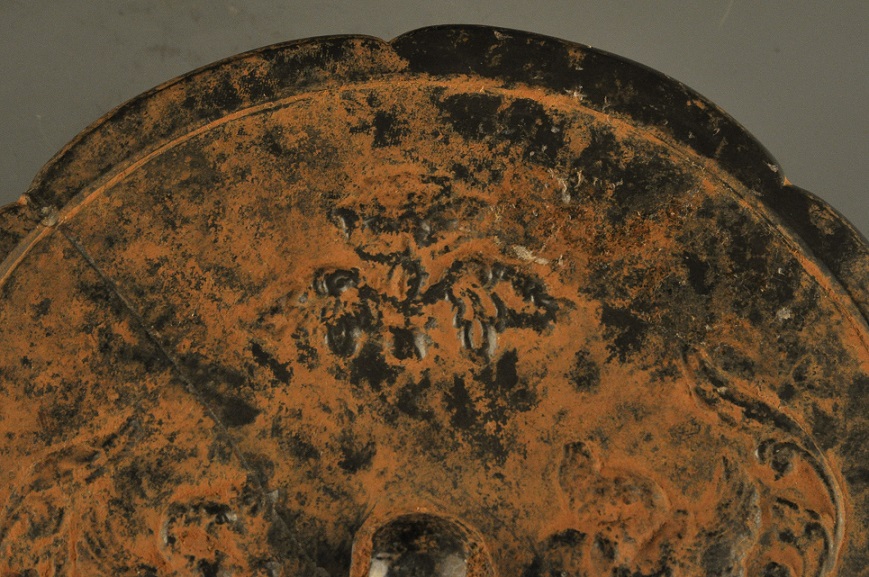 形态特征:八瓣葵形,窄素缘,圆纽,无纽座,区内饰双凤朝阳纹饰,此器完整,镜面光洁。