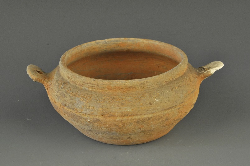 形态特征:直口,扁圆腹,平底。肩部对应各安有一耳,并依稀可辨~纹,腹部饰一圈弦纹,素胎,胎质坚硬。