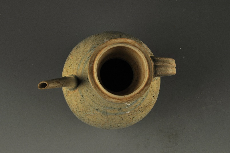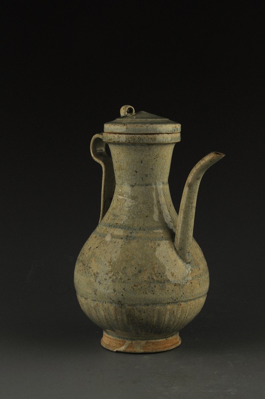形态特征:直口,方唇,弧形盖,圆纽,长颈,斜溜肩,圆腹,外撇高圈足。肩两侧对置微曲长流和高耸的扁曲执柄,肩及腹部起弦纹三道,腹下部