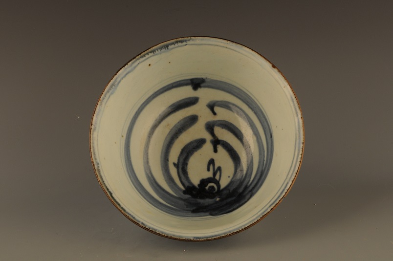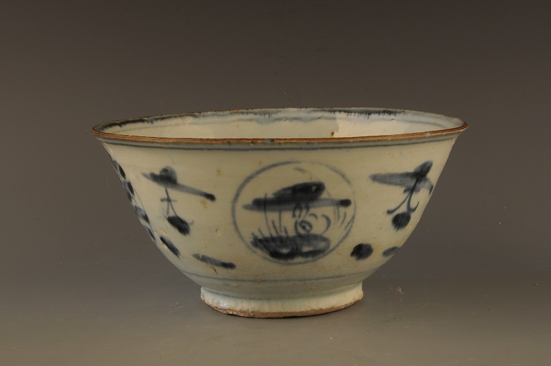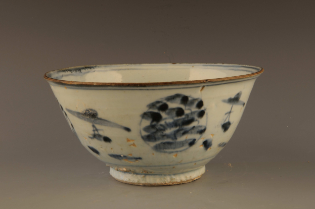 形态特征:撇口,深弧壁,圈足。碗内壁近口沿处绘两圈弦纹,碗内底及外壁以青花花卉为饰,整器釉面光洁。