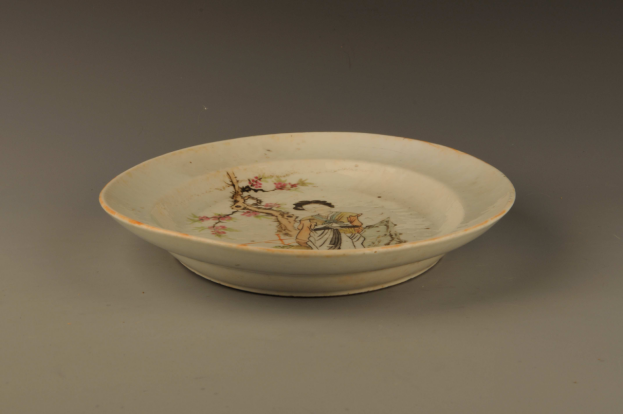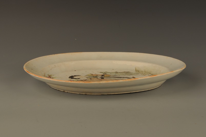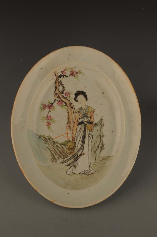 形态特征:宽沿,卷唇,卧足,盘呈椭圆形,内底以五彩为饰,假山,桃树下一仕女长裙,飘带,手执绢扇,亭亭玉立,面如桃花,人物生动,色泽