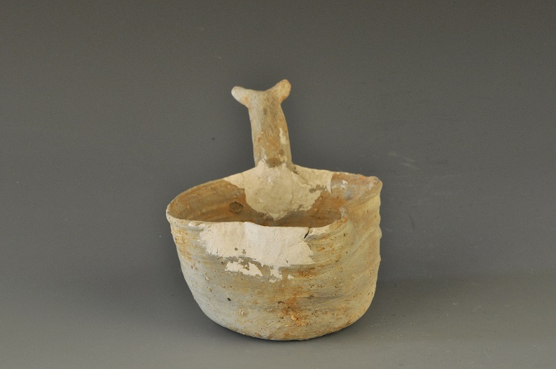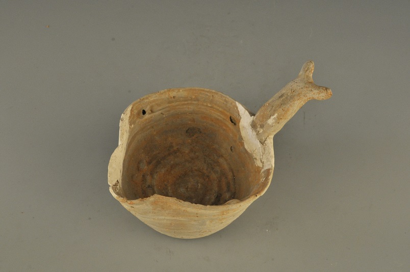 形态特征:陶质,扁圆形,平底,口部前侧有较宽的出水流,对应一侧有一Y型手柄,是一种古代盥洗用具,素胎。