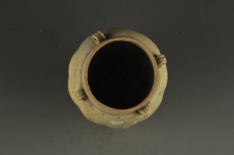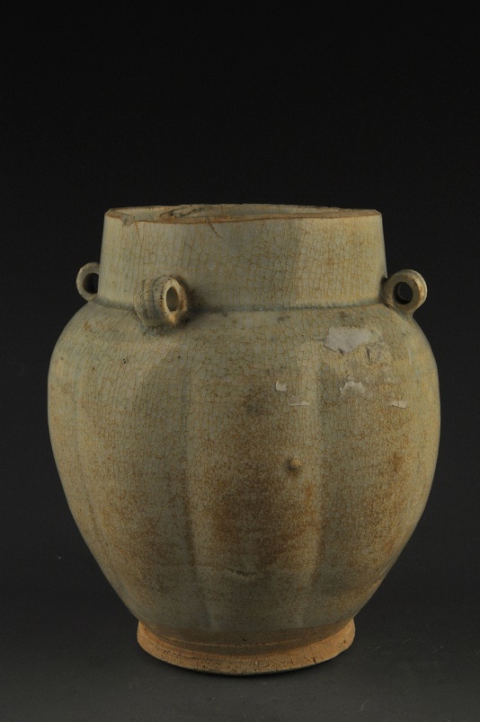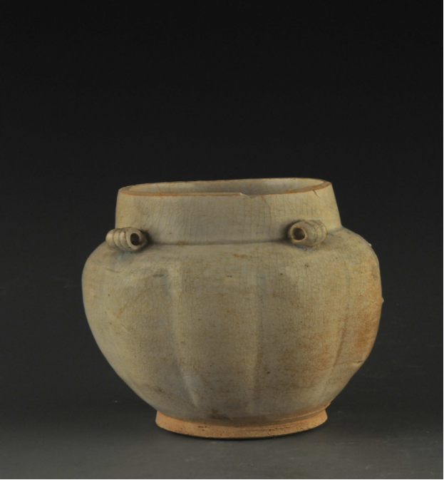 形态特征:直口,束颈,丰肩,圆腹呈瓜棱形,矮圈足稍外撇,肩部对应置四个圆环系,通体是青白釉,口沿残缺。
