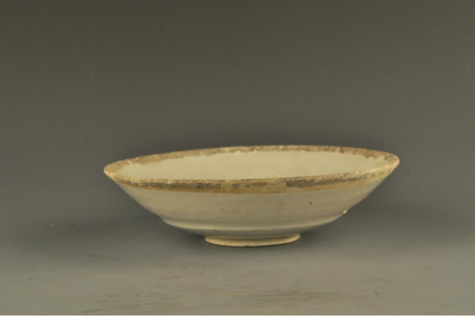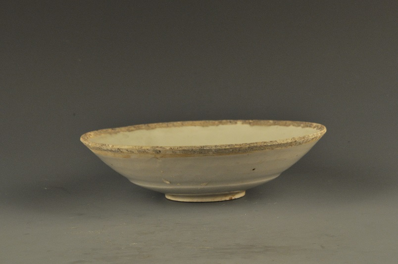 形态特征:芒口,浅弧壁,折腹,矮圈足,碗内壁饰划花纹饰,通体施青白釉,胎薄