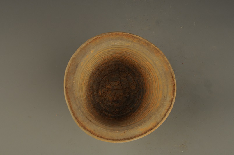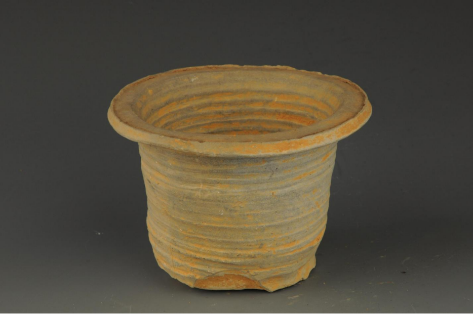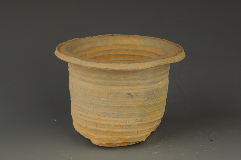 形态特征:灰陶质,侈口,平底。器身作圆桶状,直壁。腹部饰多重弦纹,1989年抚北镇商代遗址中出土。