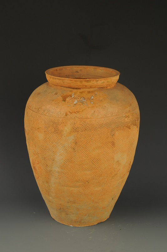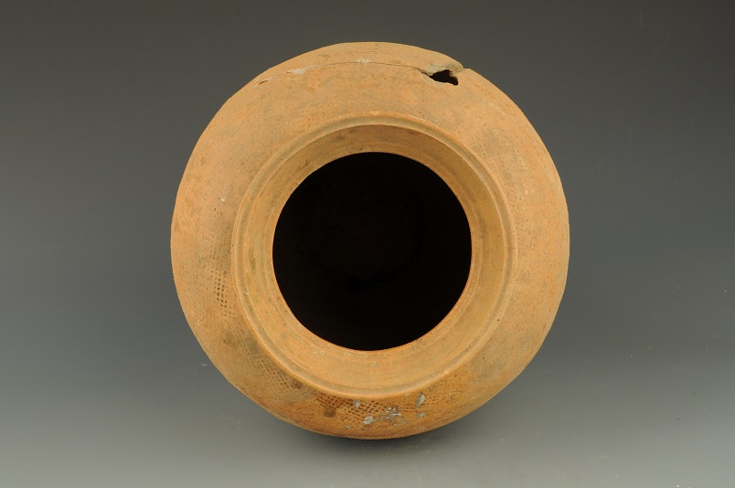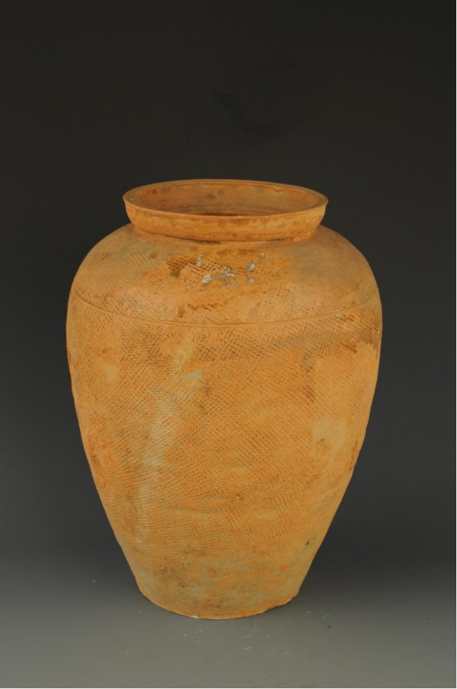 形态特征:侈口,丰肩,长圆腹渐下收至底,平底,肩部饰一道弦纹,腹部饰拍印的网格纹。1989年抚北镇东汉墓葬出土时腹部严重残破。