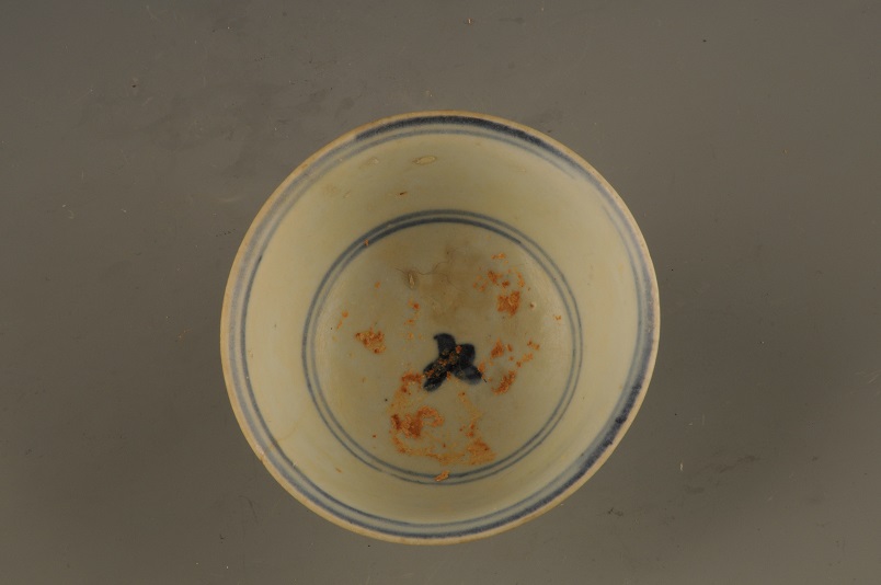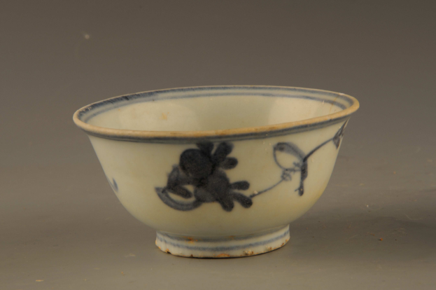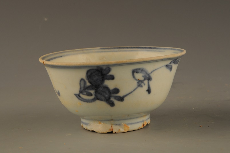 形态特征:口微撇,深孤壁,圈足。碗内壁近口沿处及内底以青料各绘二圈弦纹,碗外壁以青花花卉图案为饰。