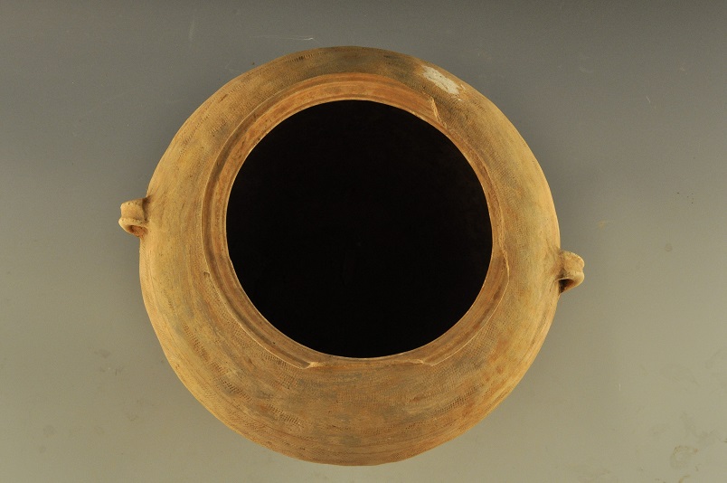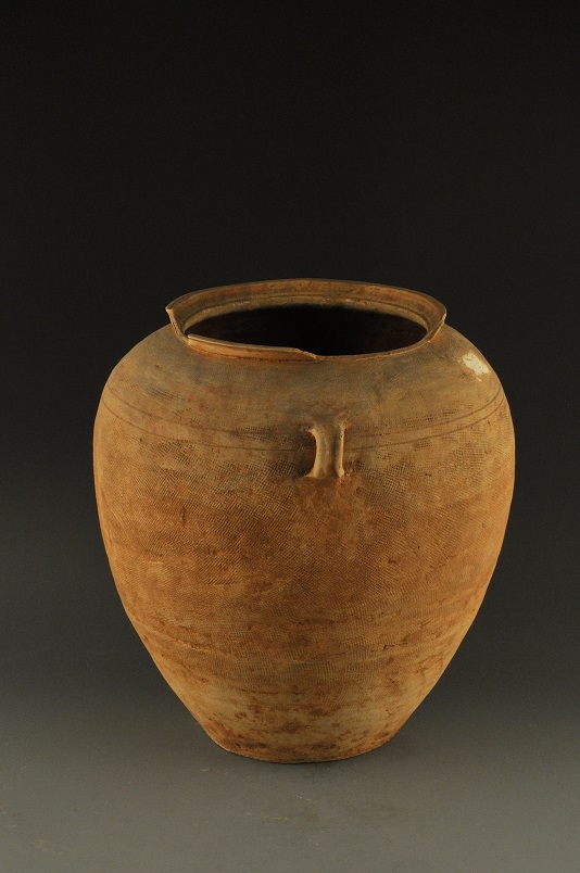 形态特征:侈口,丰肩,长圆腹渐下收至底,平底,肩部对应各置一桥形系,腹部饰拍印的网格纹,素胎,此器制作稳重,实用,高大,胎体厚重坚